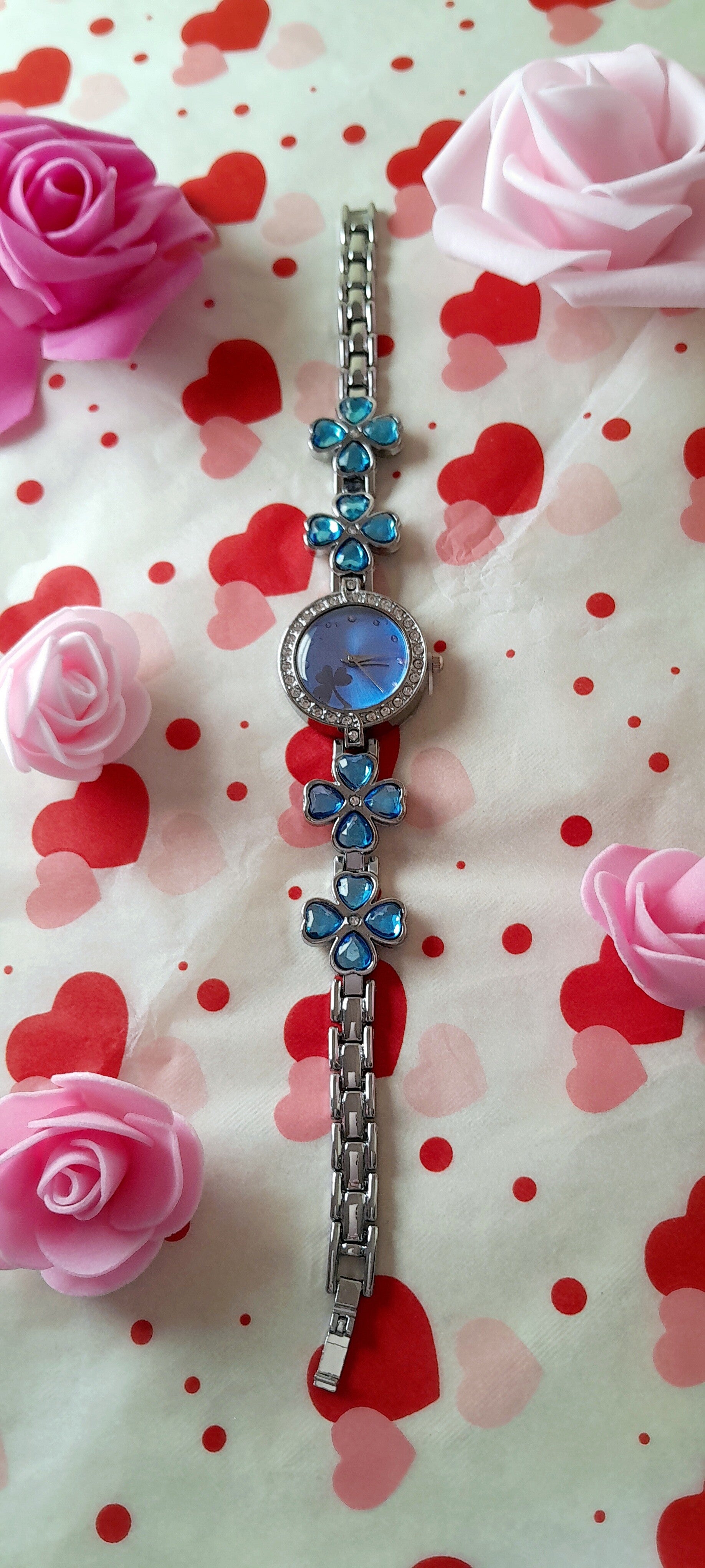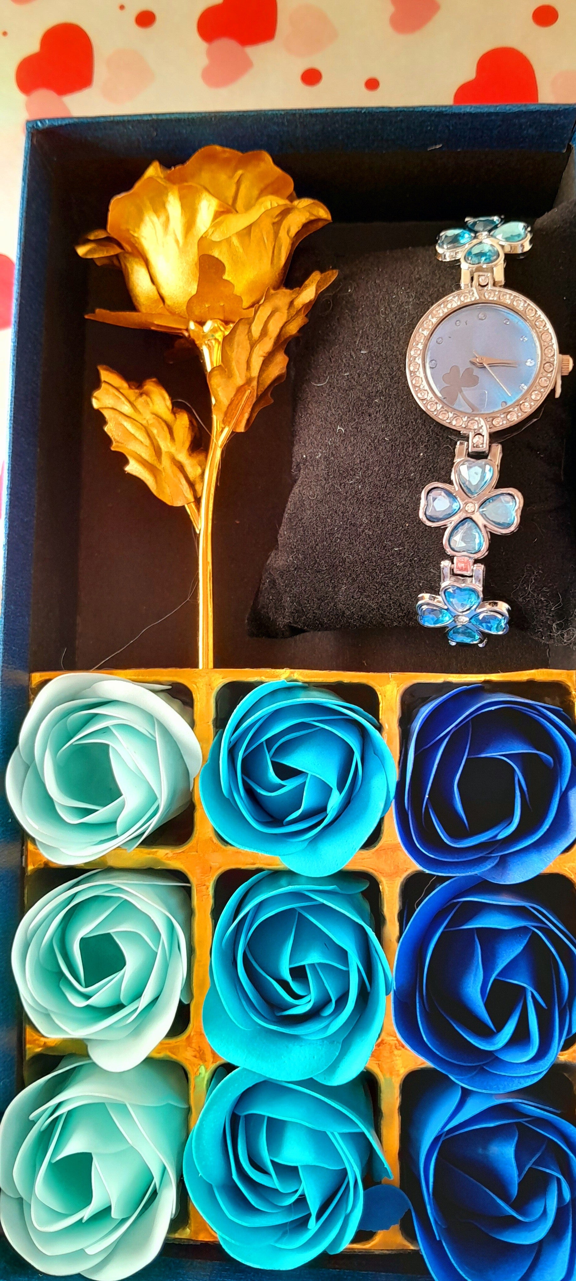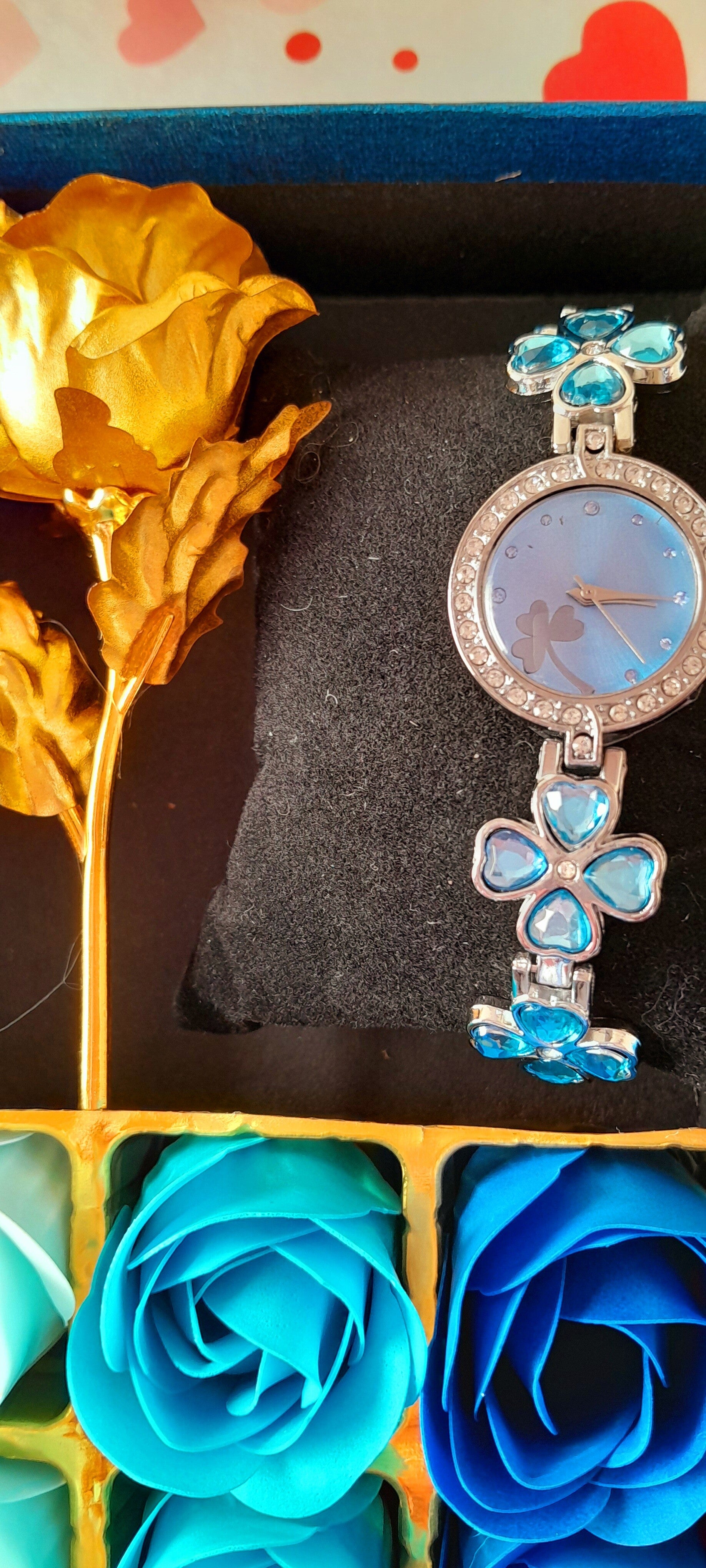 Coffret " le temps d'un instant" comprend 9 roses bleue de savons qui parfumeront délicatement le bain, 1 rose éternelle or et 1 montre en strass de zircon cubique bleus et acier doré inoxydable