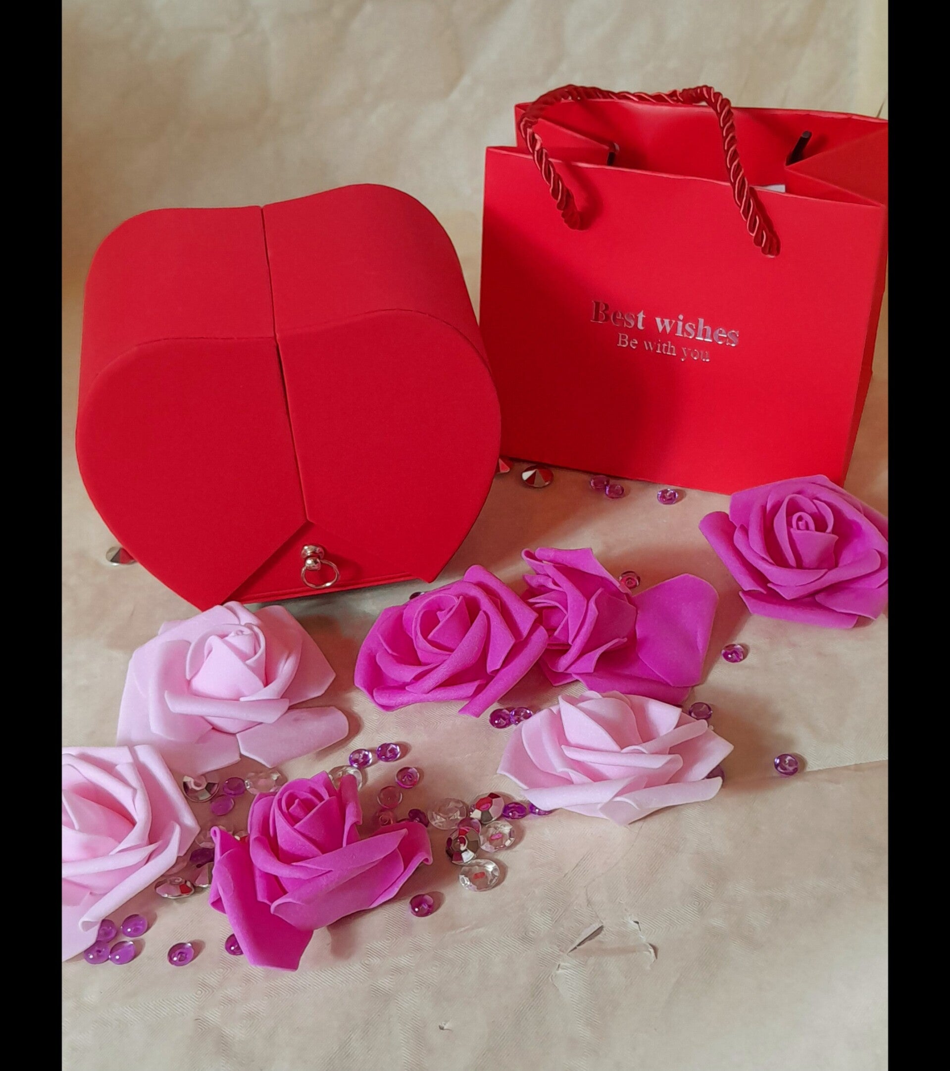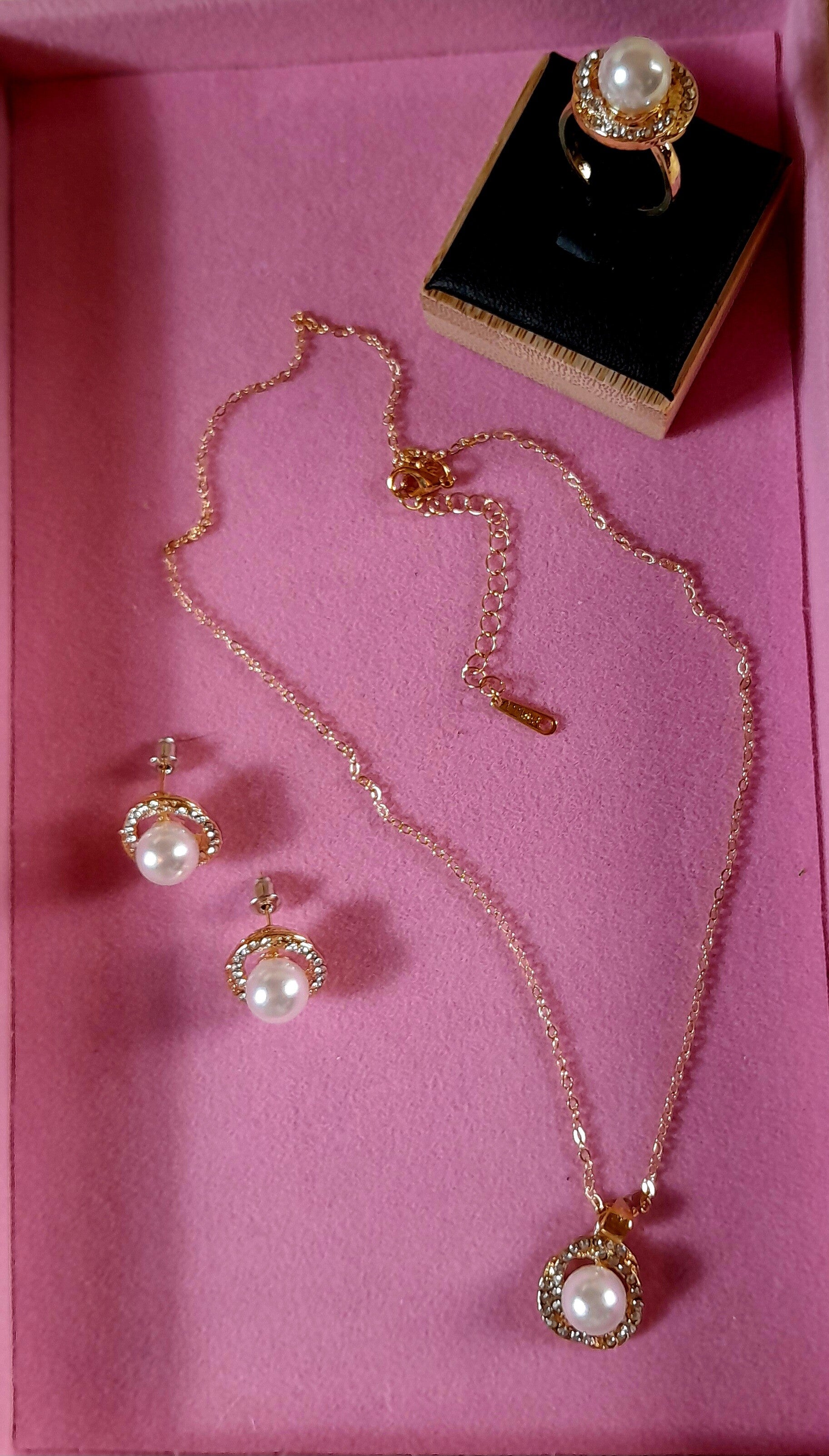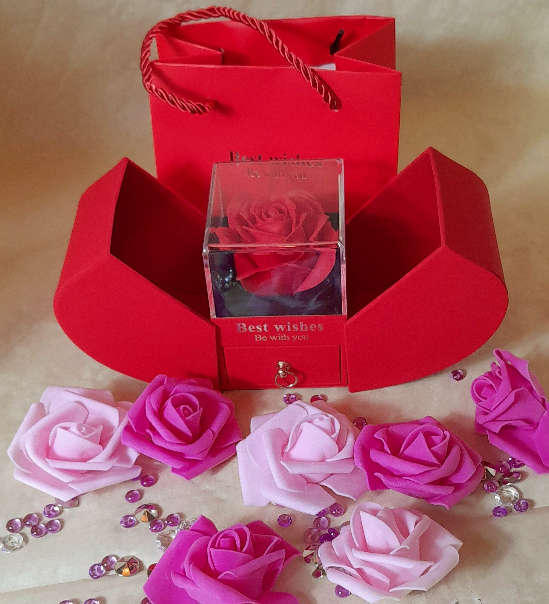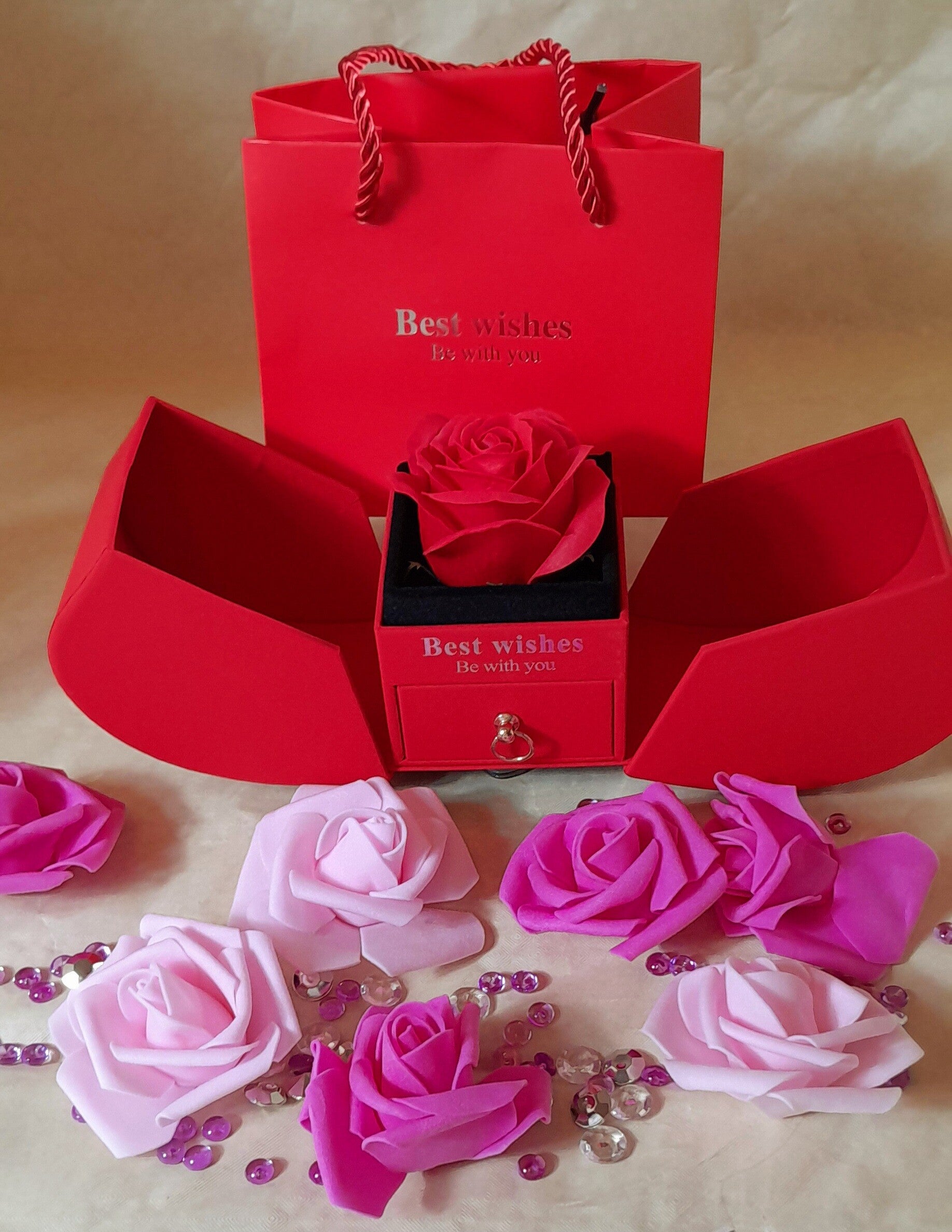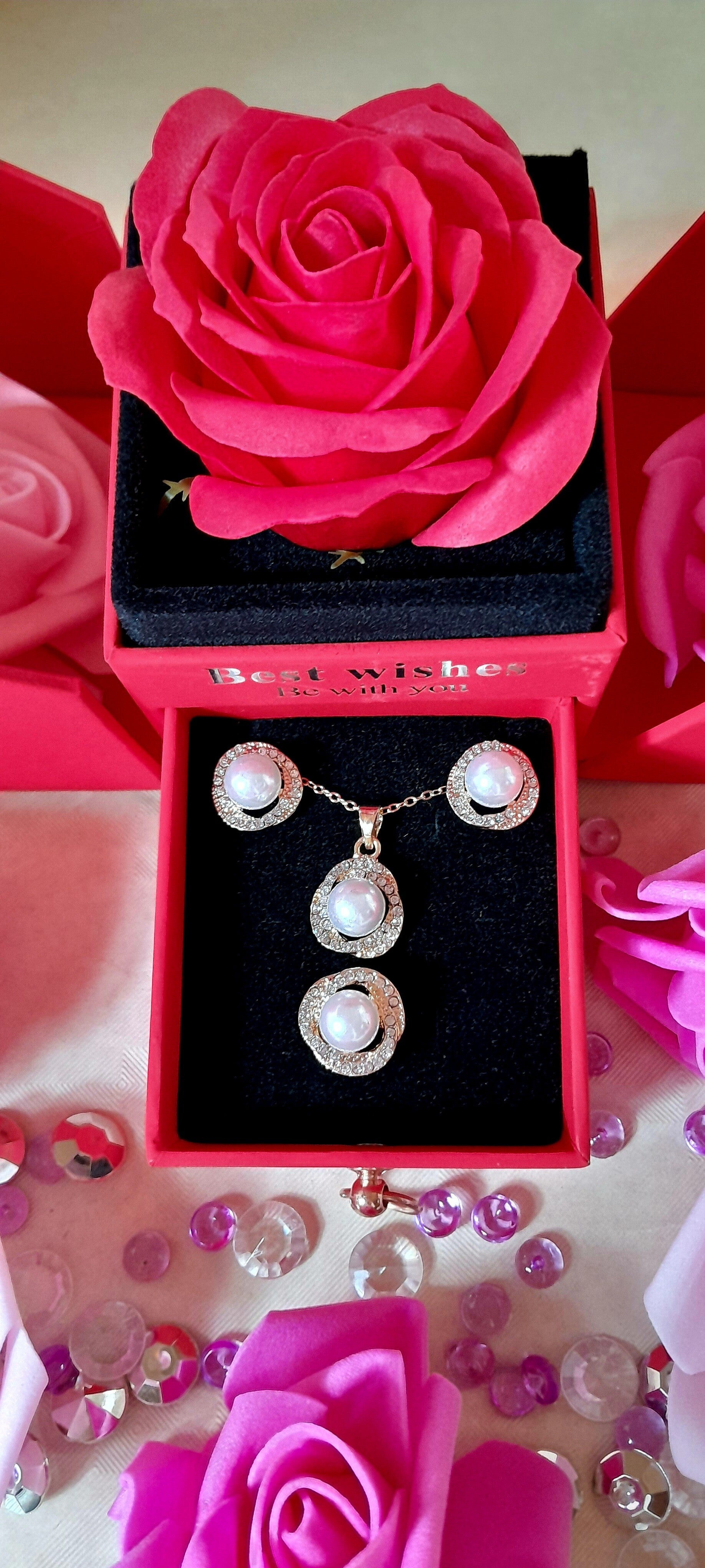 Boîte à bijoux exceptionnelle par son dising et sa fonctionnalité, en ouvrant le tiroir vous découvrirez une magnifique parure avec 1 collier, 1 paire de boucle d'oreilles et une bague ajustable avec des strass et des perles nacrées synthétiques le tout est sublimé par une rose éternelle. Ce coffret mettra en valeur le meuble sur lequel il sera posé et saura le temps d'un instant envahir de joie la personne qui le recevra, plus qu'un cadeau une véritable preuve d'amour