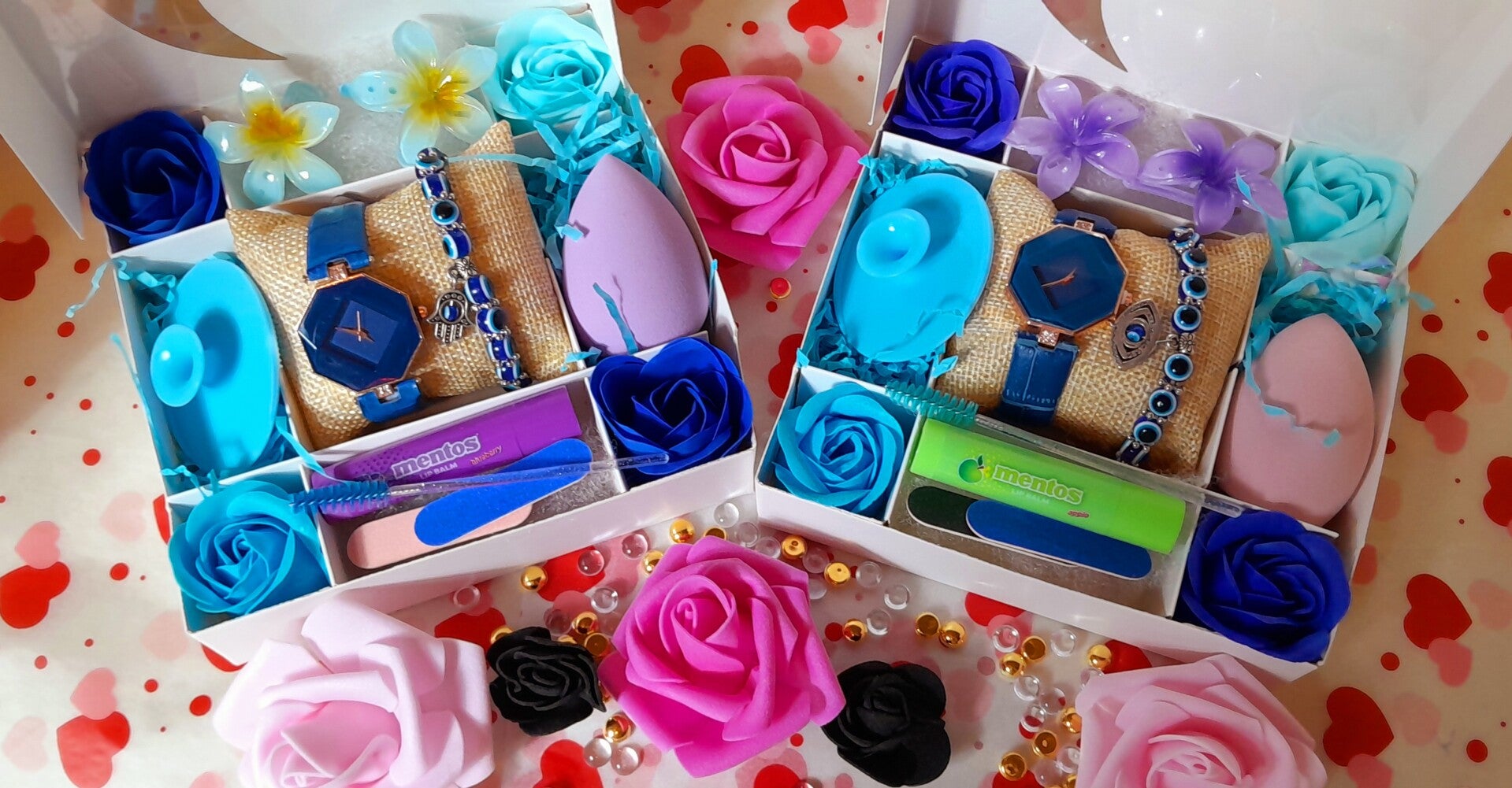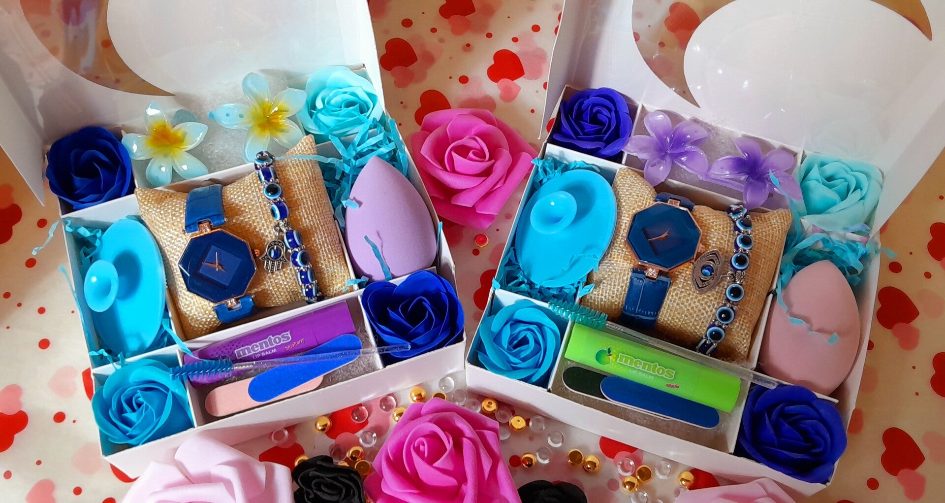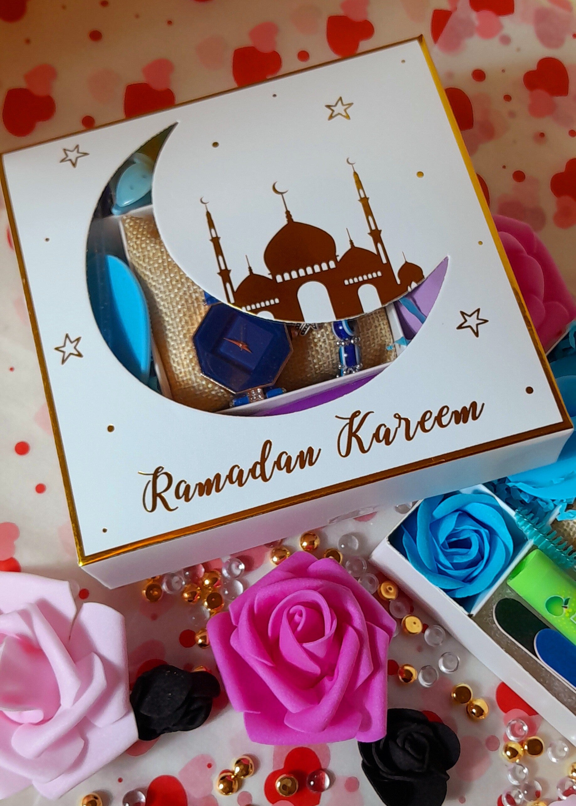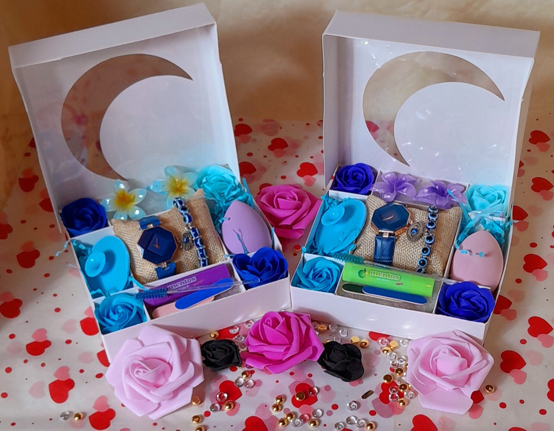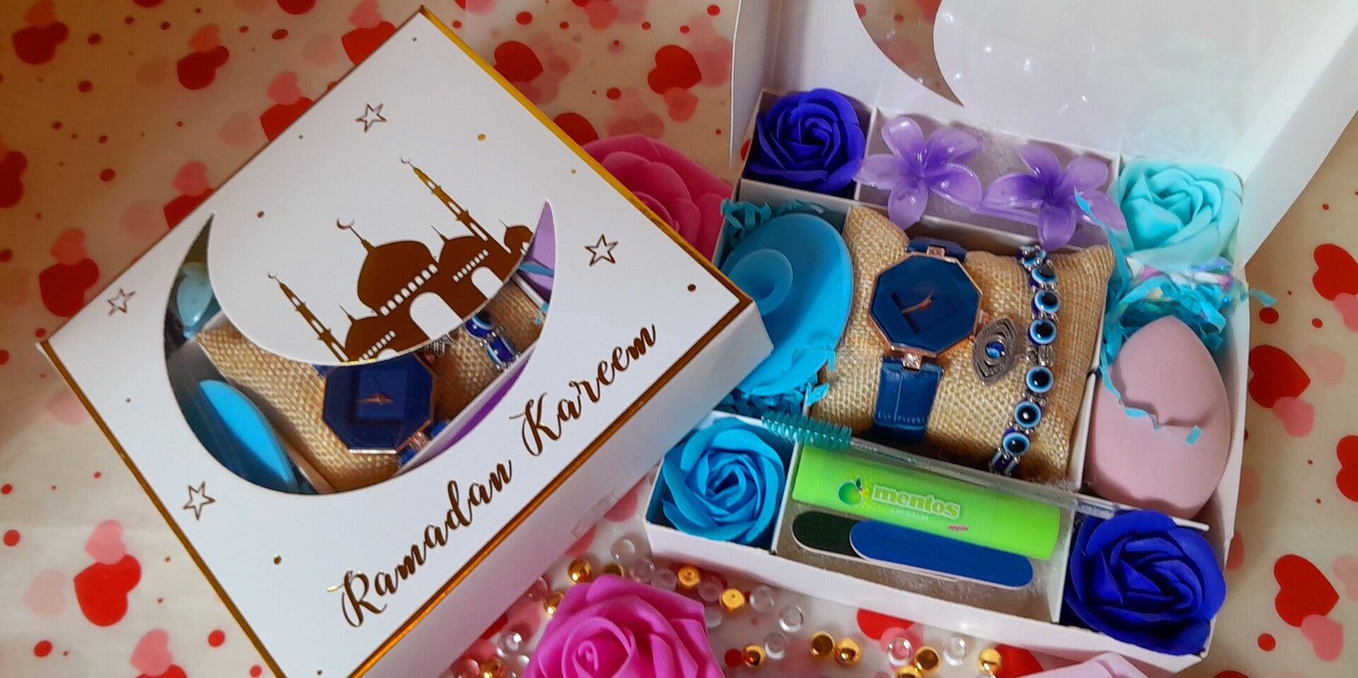 Coffret lune🌛 spéciale Eid Mubarak avec montre bleue et bracelet œil de protection le coffret comprend 1 éponge exfoliante pour le visage, une éponge à maquillage, 1 brosse à cils, 1 baume à lèvres, 2 limes à ongles, 2 pinces à cheveux orchidées et 3 roses savon qui parfumeront délicatement le bain. Cadeau parfait pour offrir à l'occasion des fêtes.