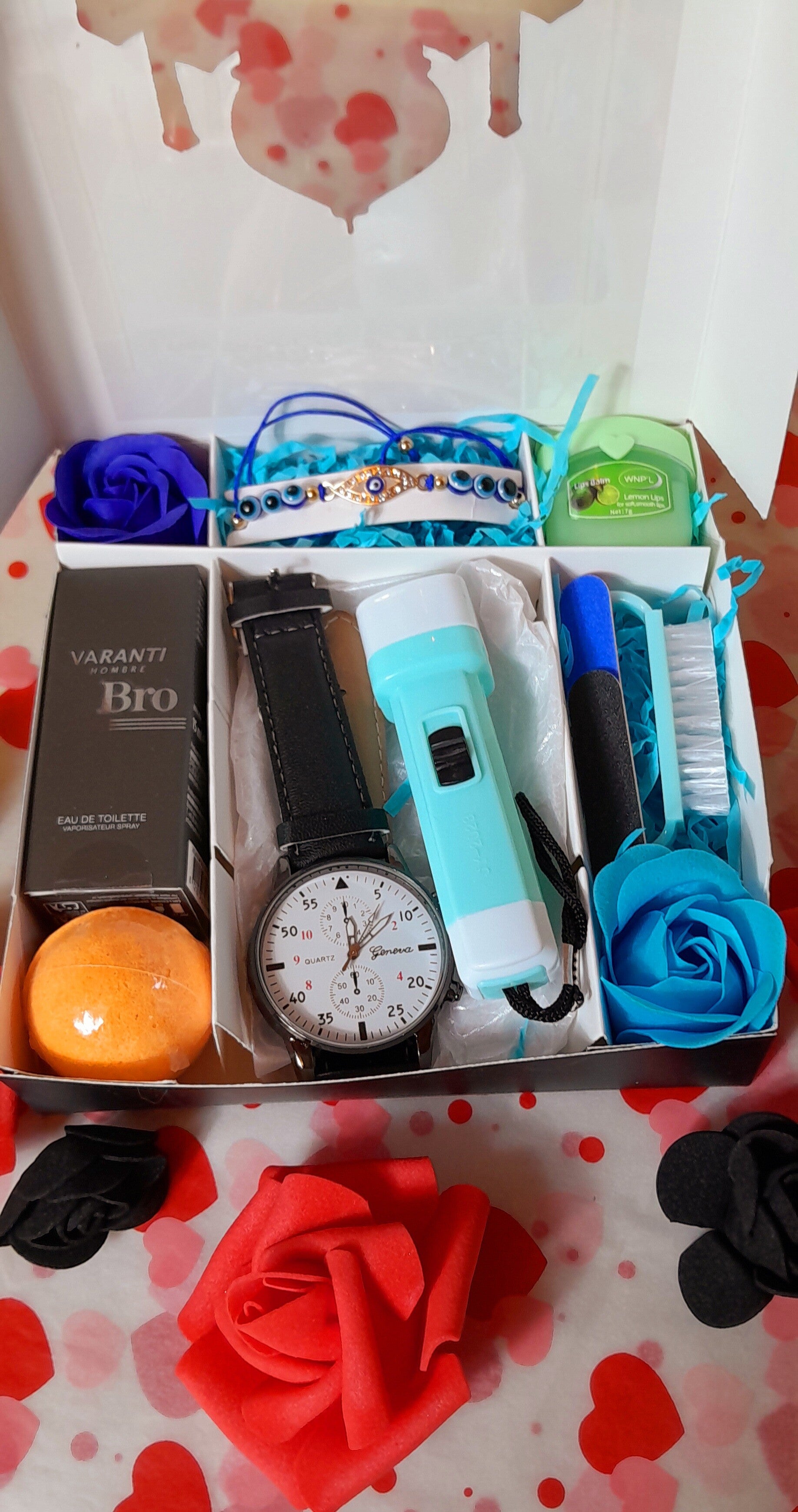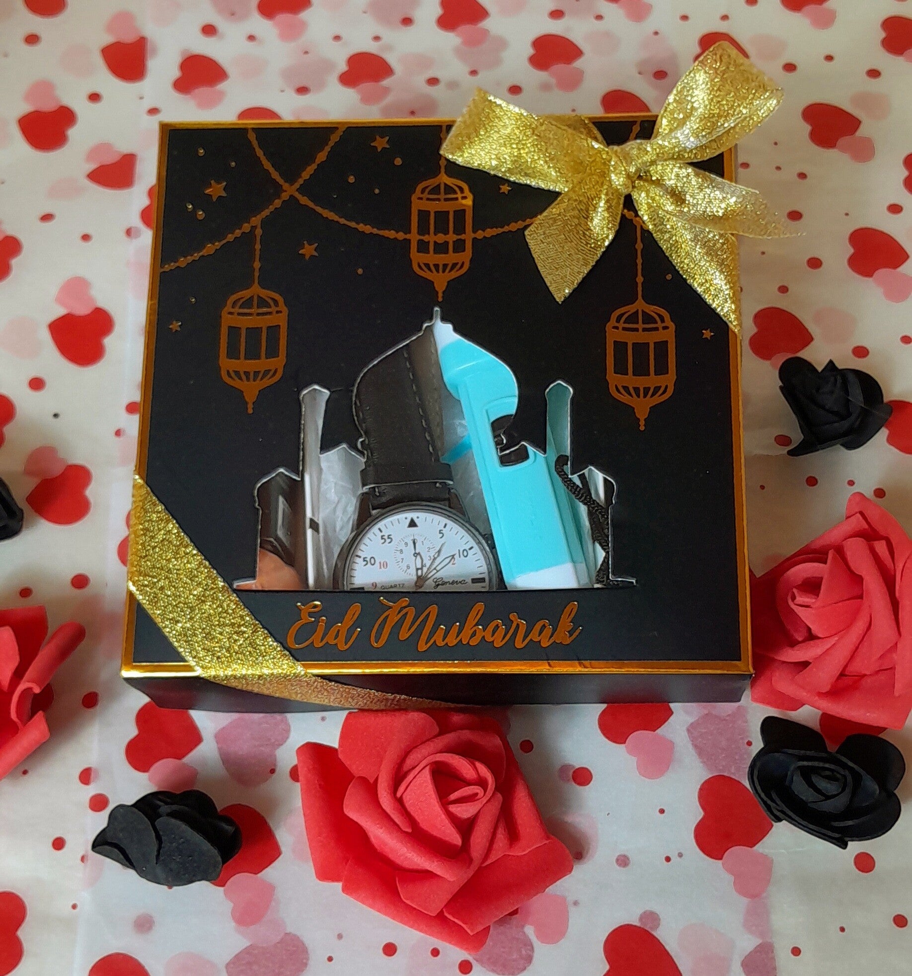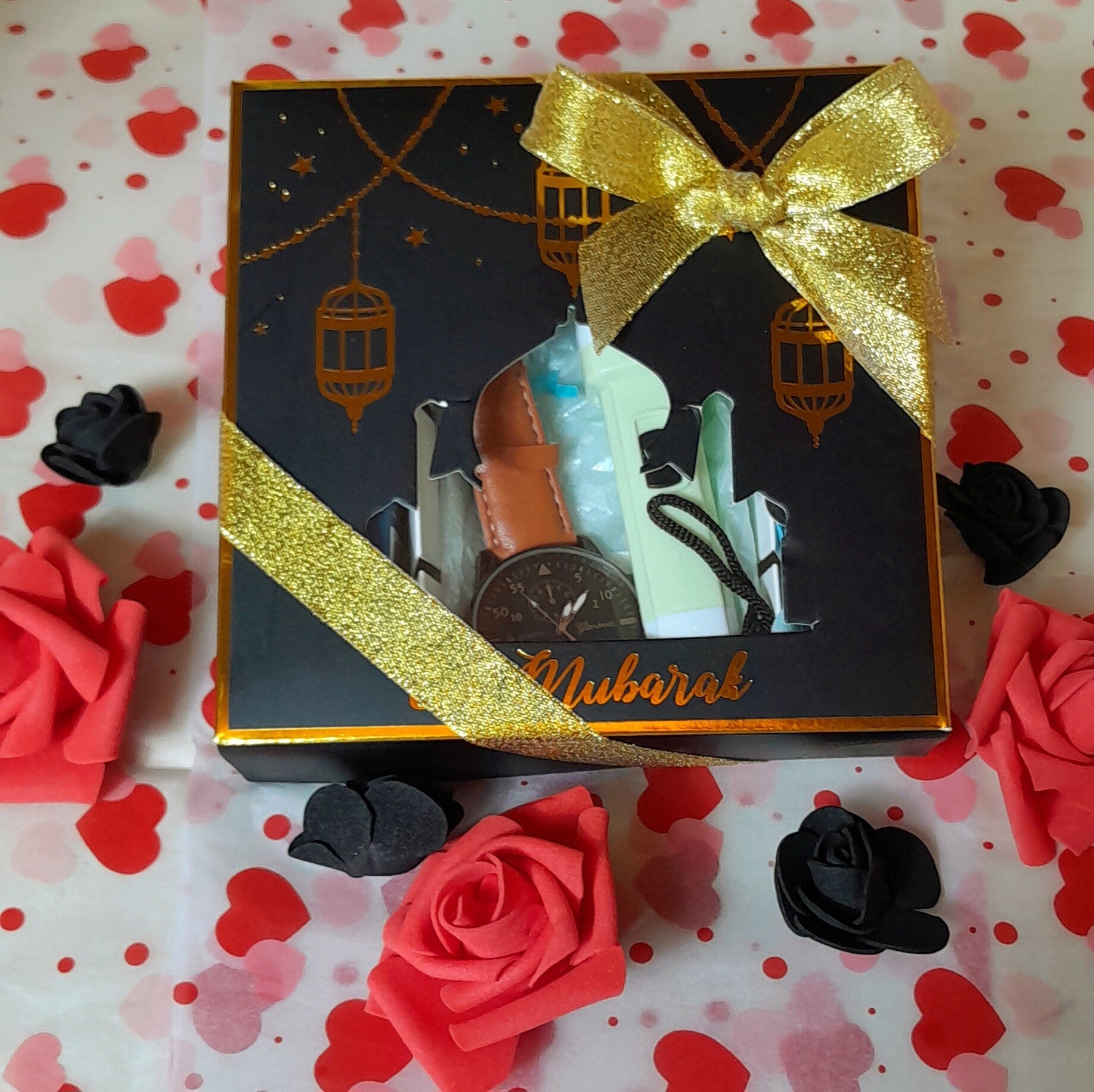 Coffret jomme noir et or Eid Mubarak avec 1 montre bracelet cuir synthétique, 1 bracelet œil de protection, 1 parfum homme, 1brosse à ongles, 1bombe de bain, 1 bombe de bain, 1 baume à lèvres vaseline et 2 roses savon qui parfumeront délicatement le bain.