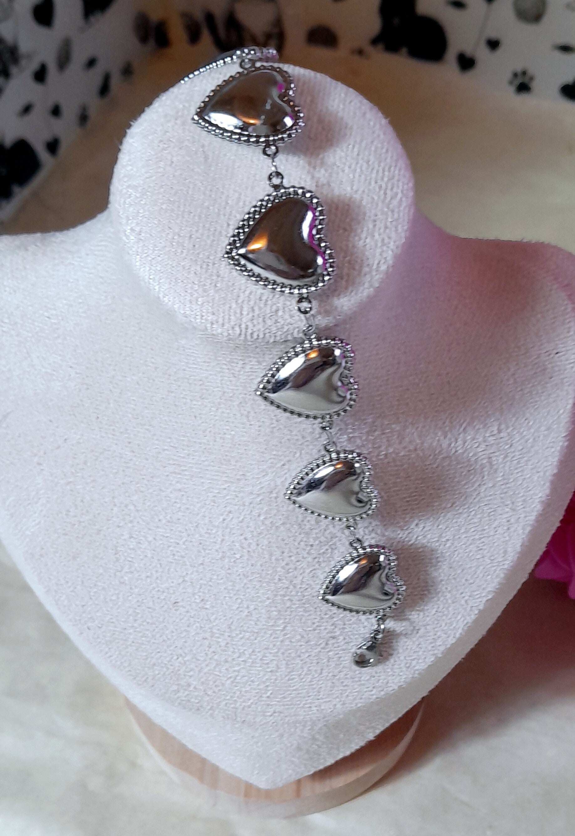 Ourson en roses fushia artificielles et un cœur blanc perlé 24cm. Il est accompagné d'un magnifique bracelet cœur en acier argenté inoxydable de 21cm dans sa pochette velour beige.