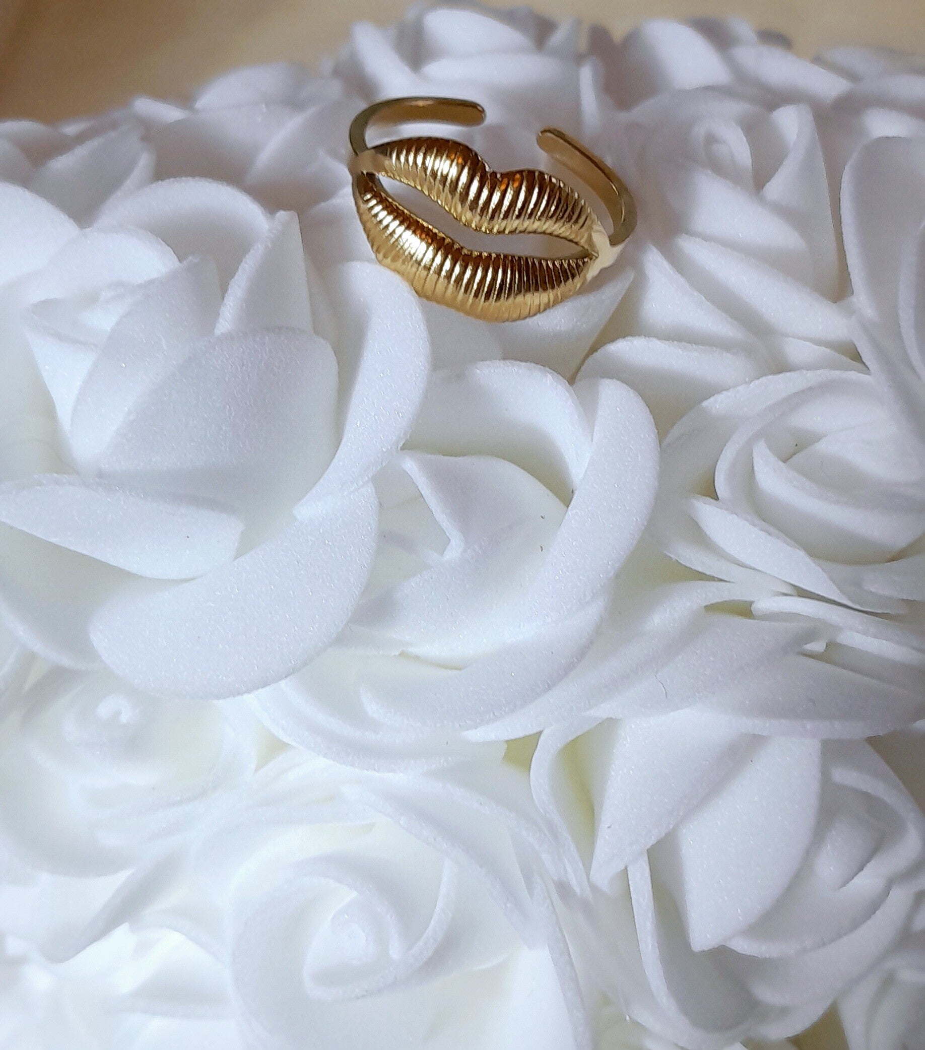 Ourson en roses blanches artificielles et un cœur rouge 21cm. Il est accompagné d'une magnifique bague ajustable "Bisou" en acier doré inoxydable dans sa pochette cadeau.