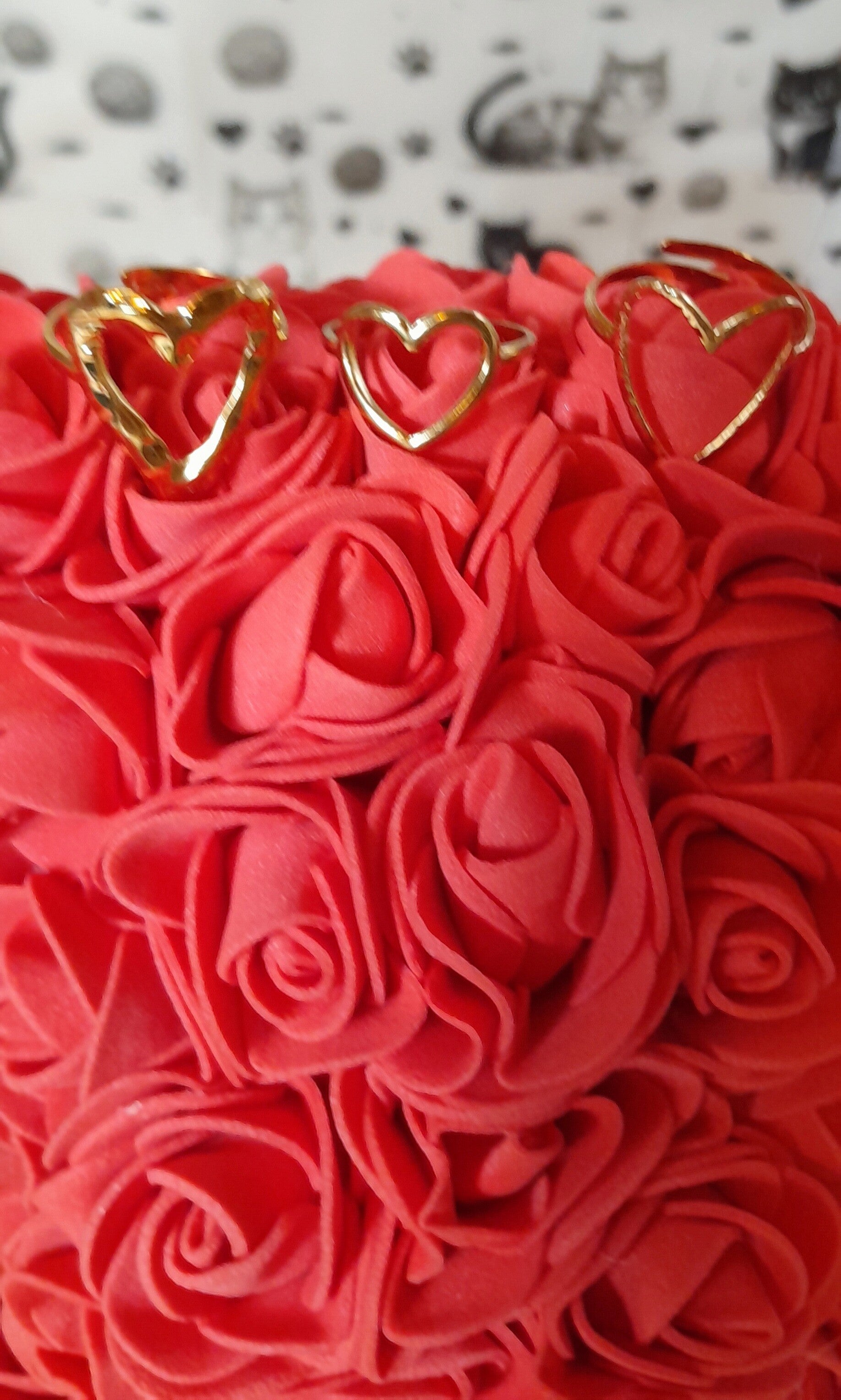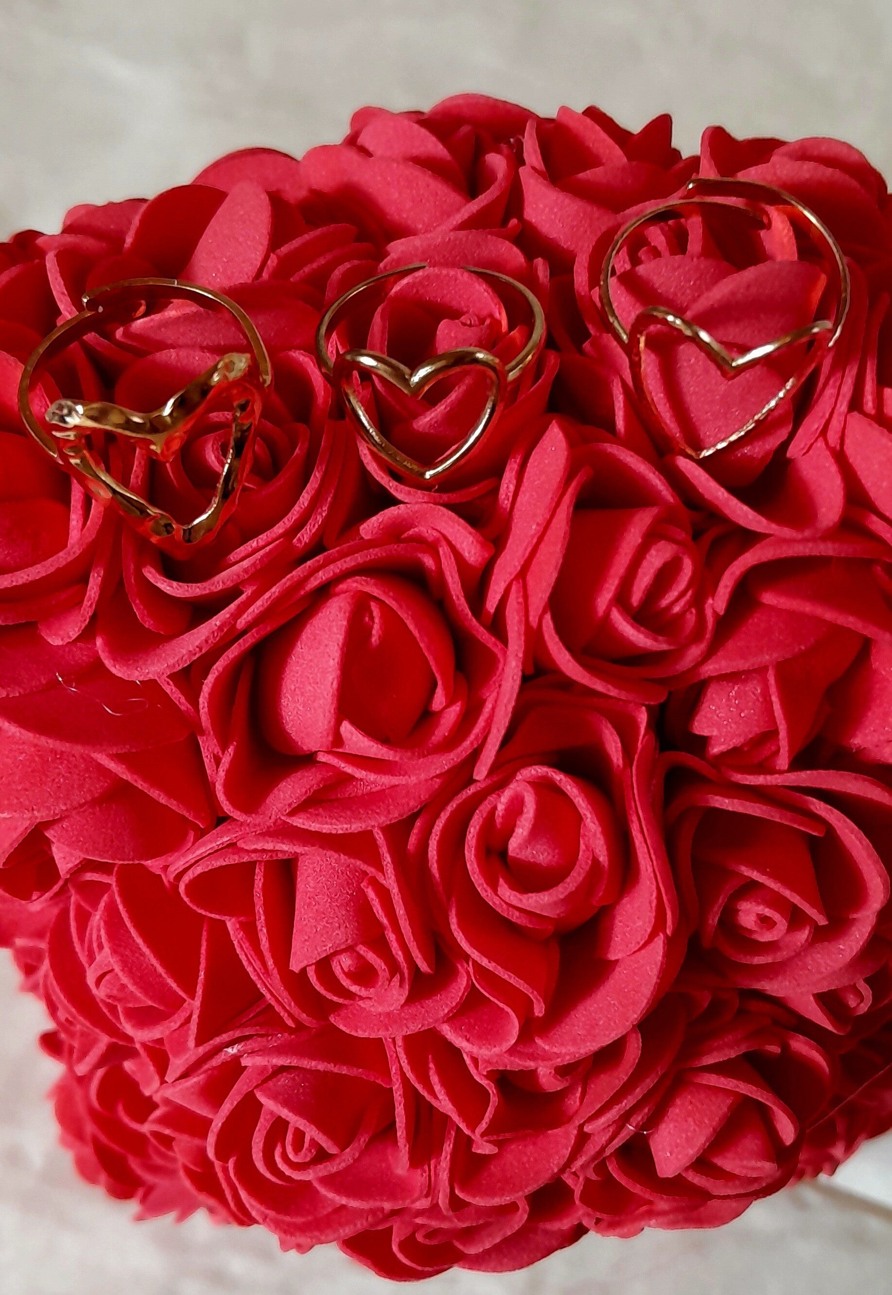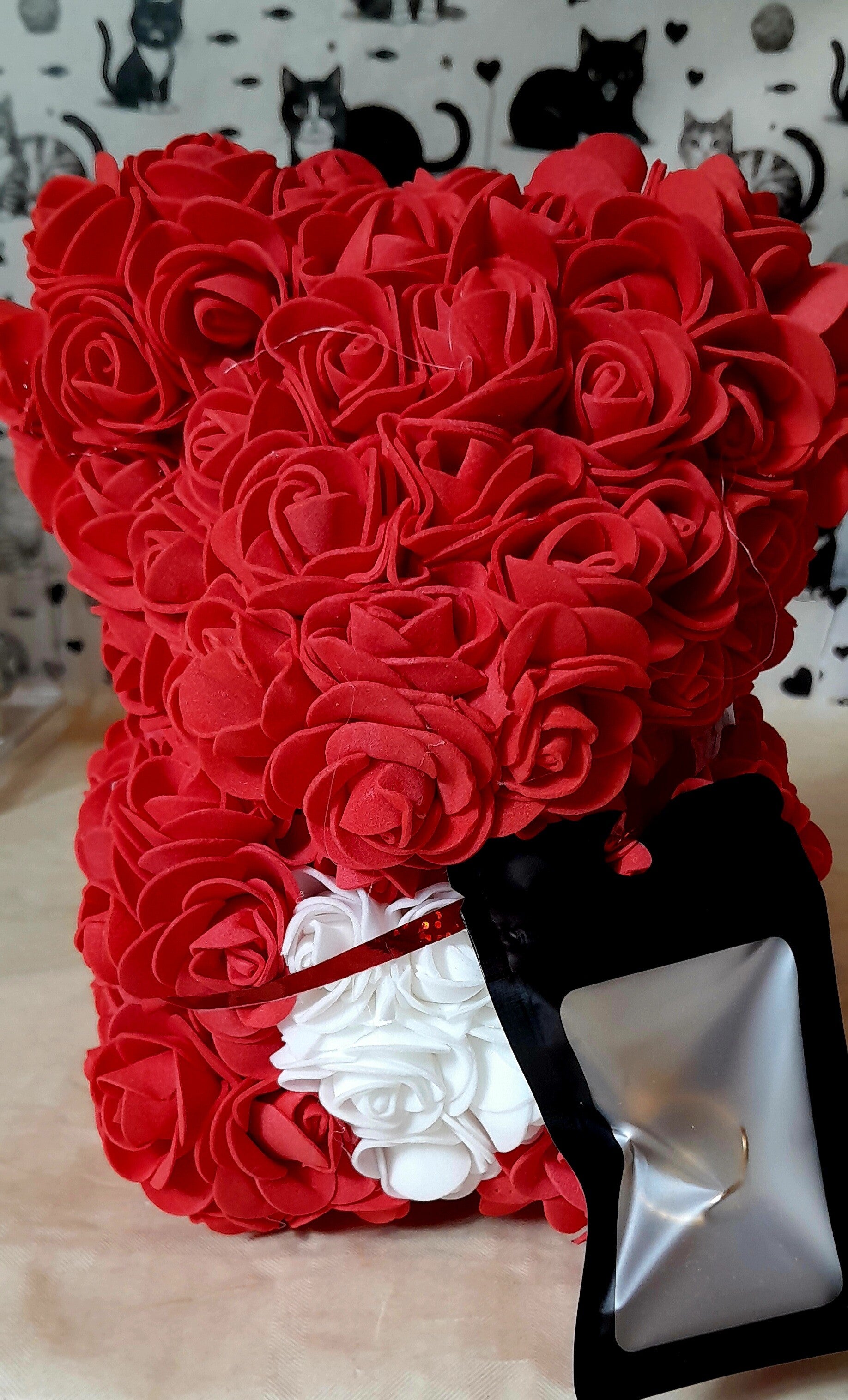 Ourson en roses rouge artificielles et un cœur blanc 21cm. Il est accompagné d'une magnifique bague ajustable cœur en acier doré inoxydable model aleatoire dans sa pochette cadeau.