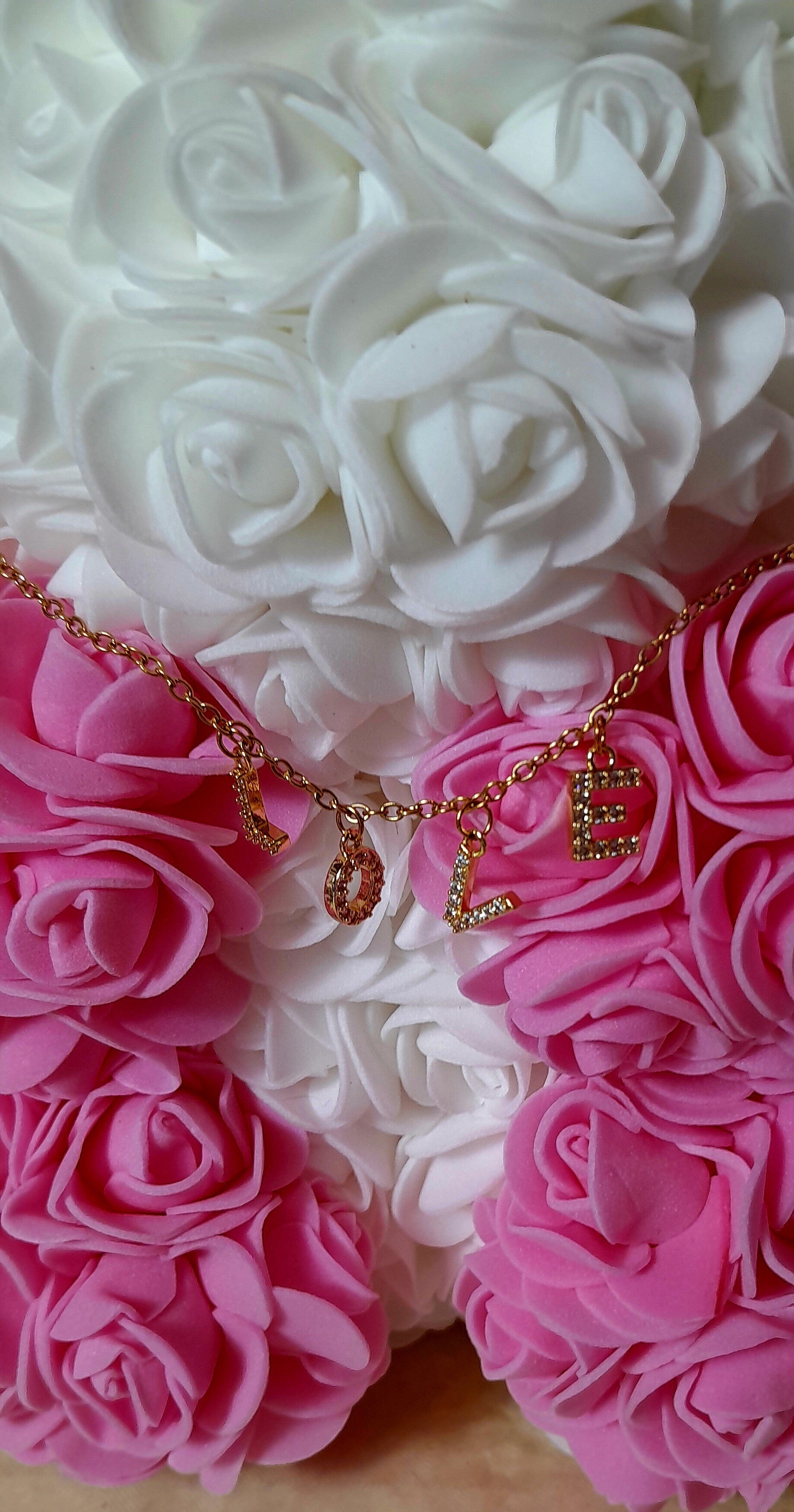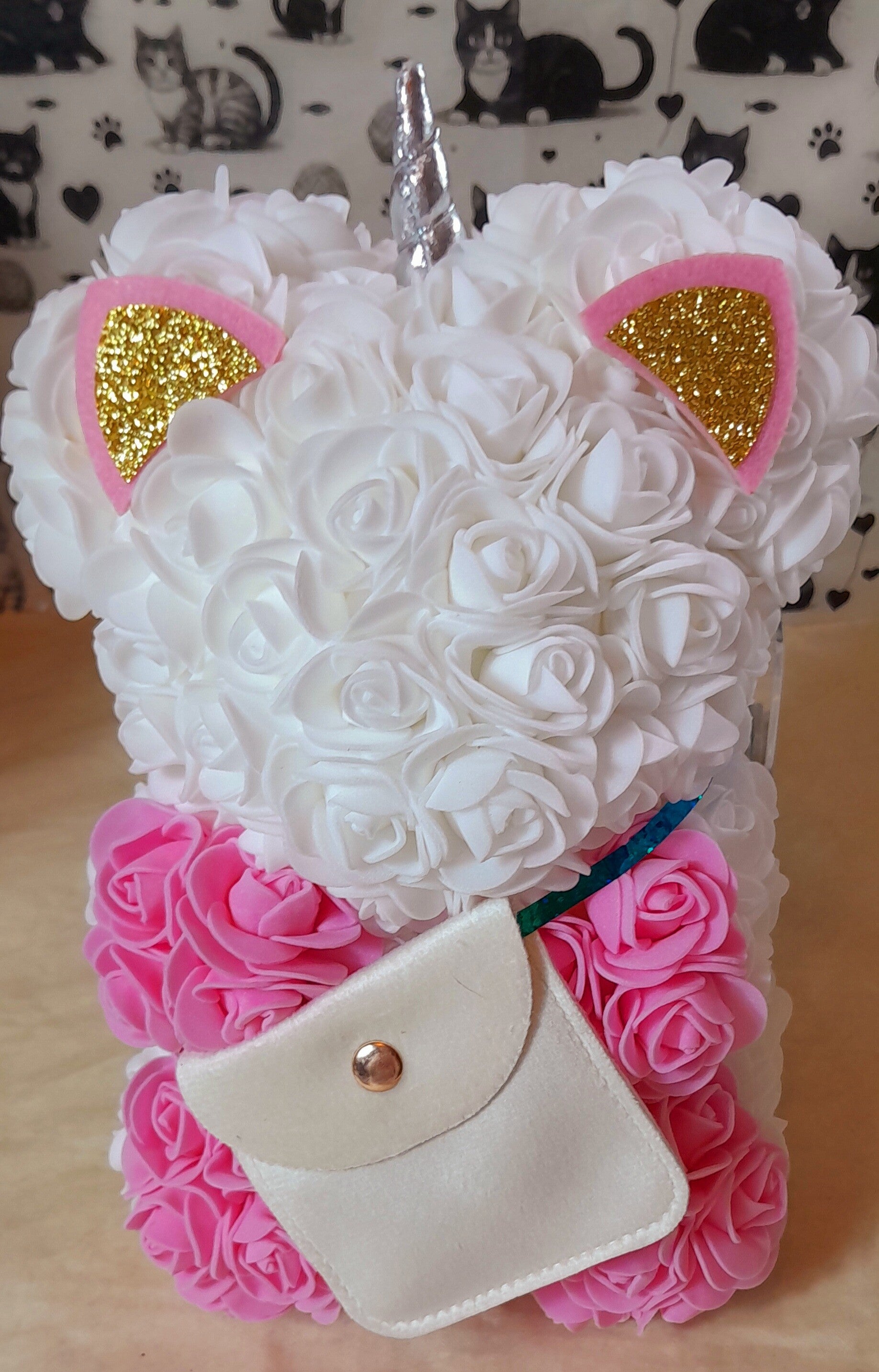 Chaton en roses blanches et roses artificielles de 24cm. Il est accompagné d'un magnifique collier "Love" en acier doré inoxydable de 50cm dans sa pochette velour beige.
