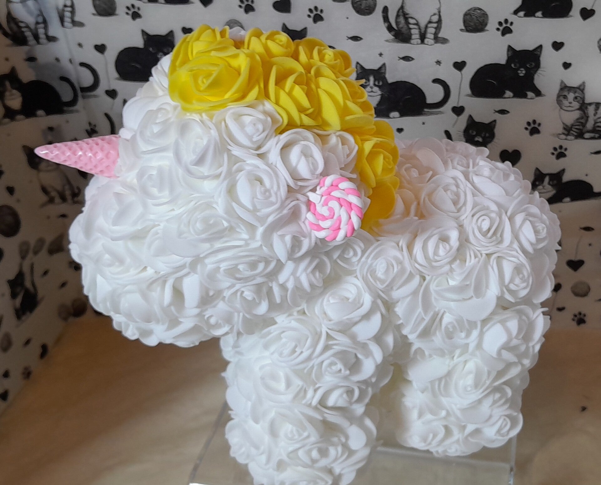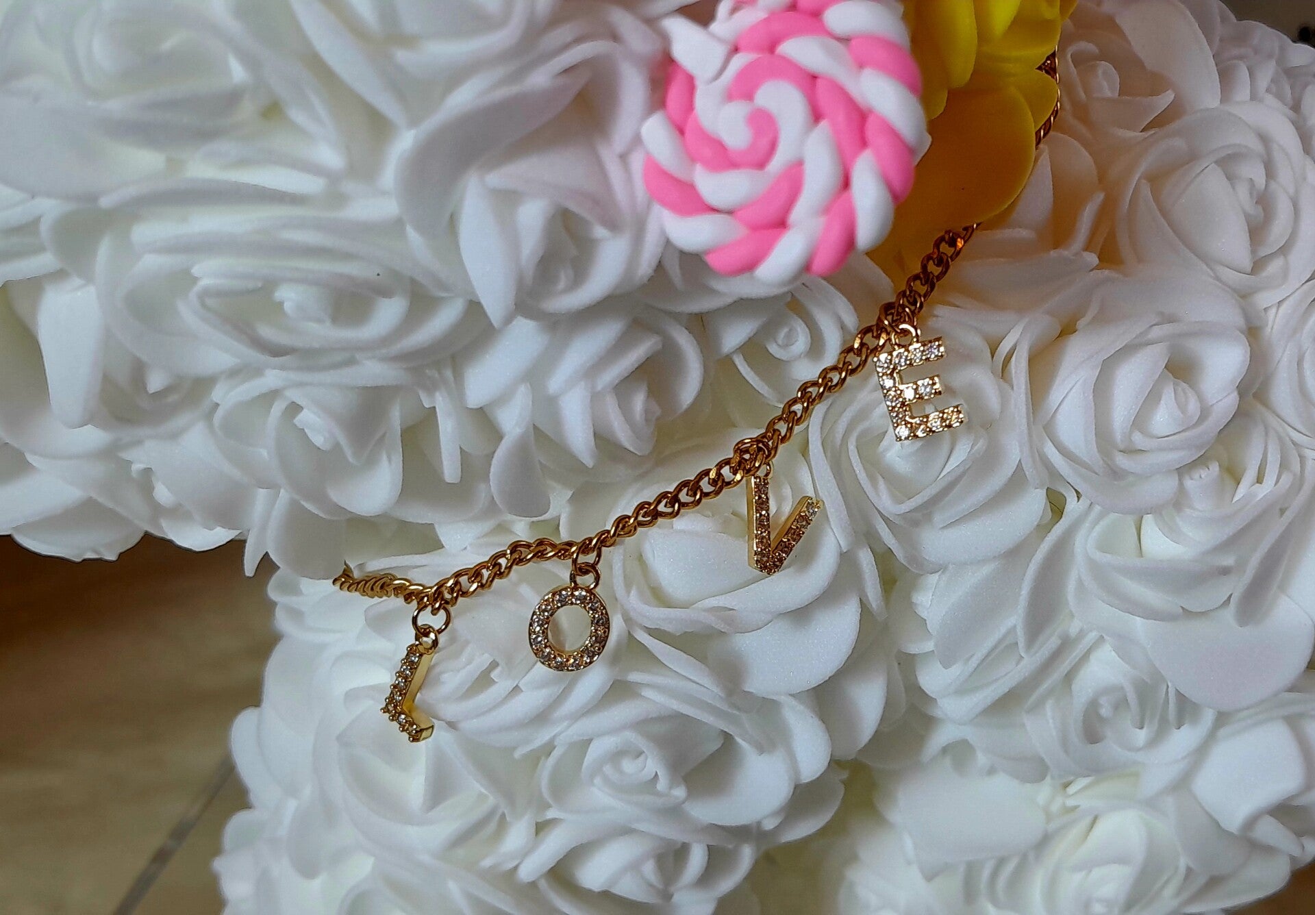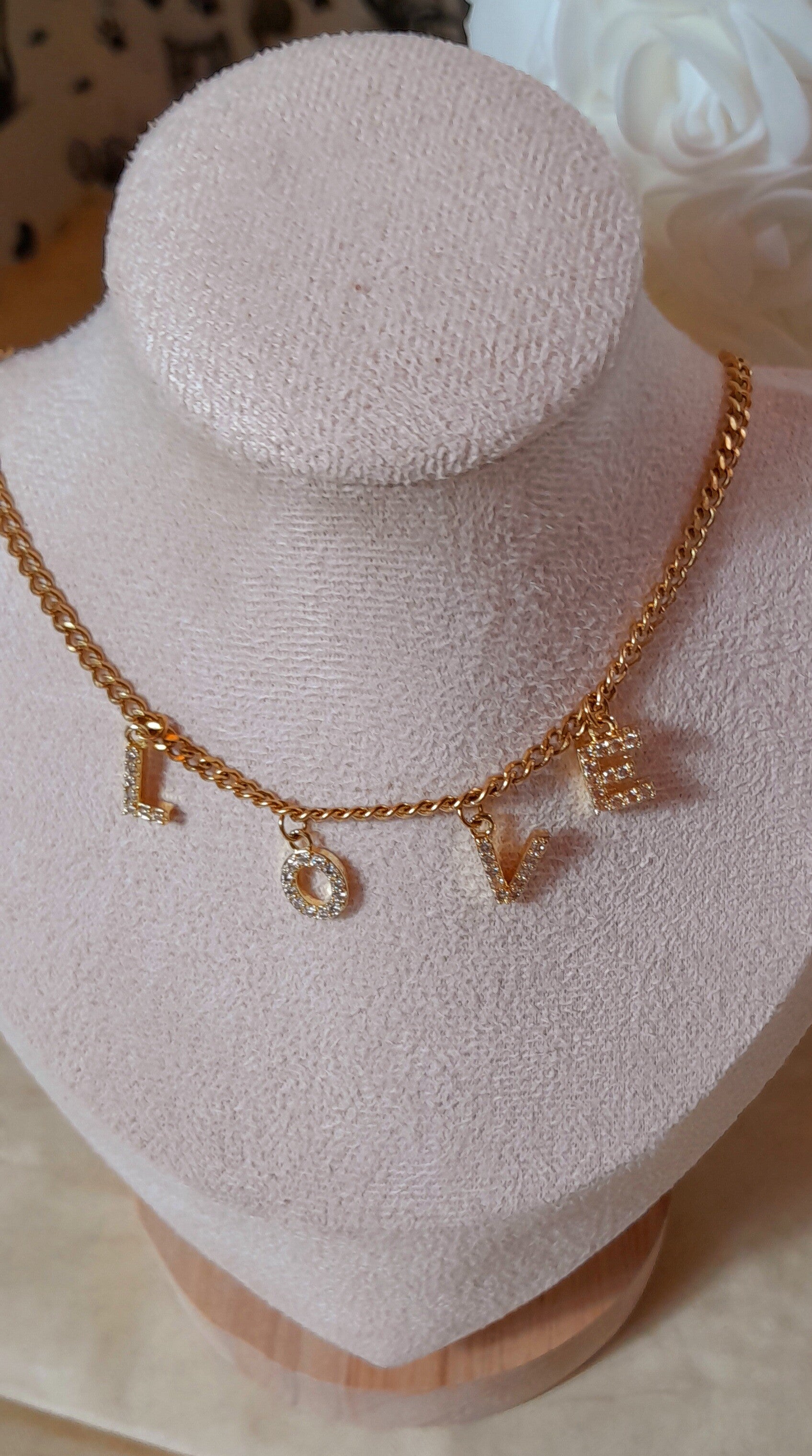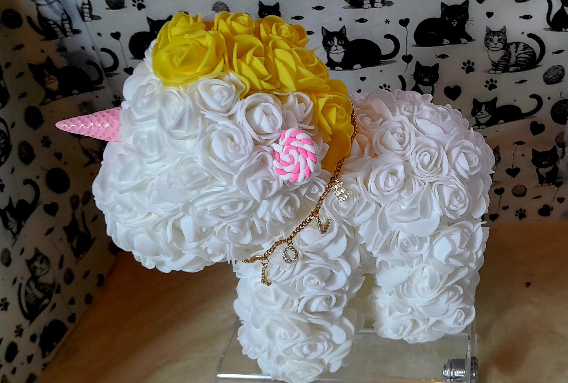 Licorne en roses blanches artificielles de 23cm. Elle est accompagnée d'un magnifique collier "Love" en acier doré inoxydable de 50cm dans sa pochette velour beige.