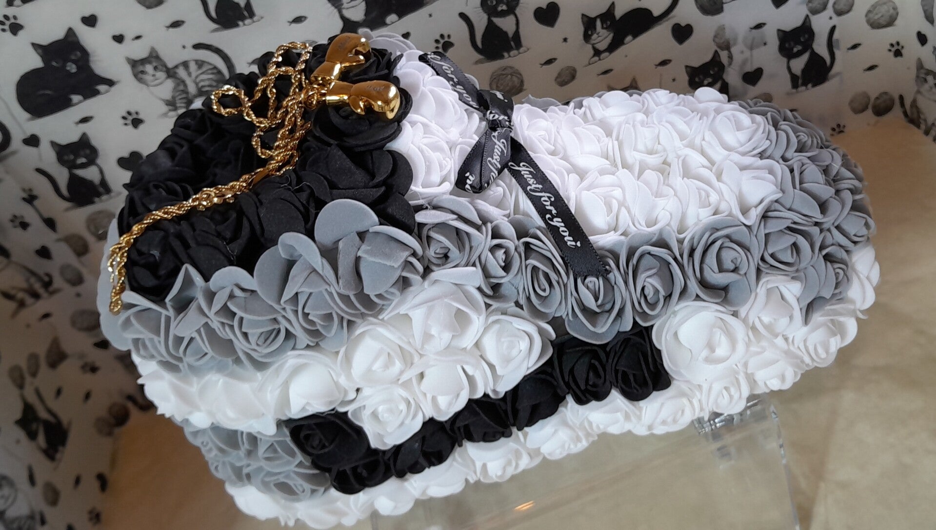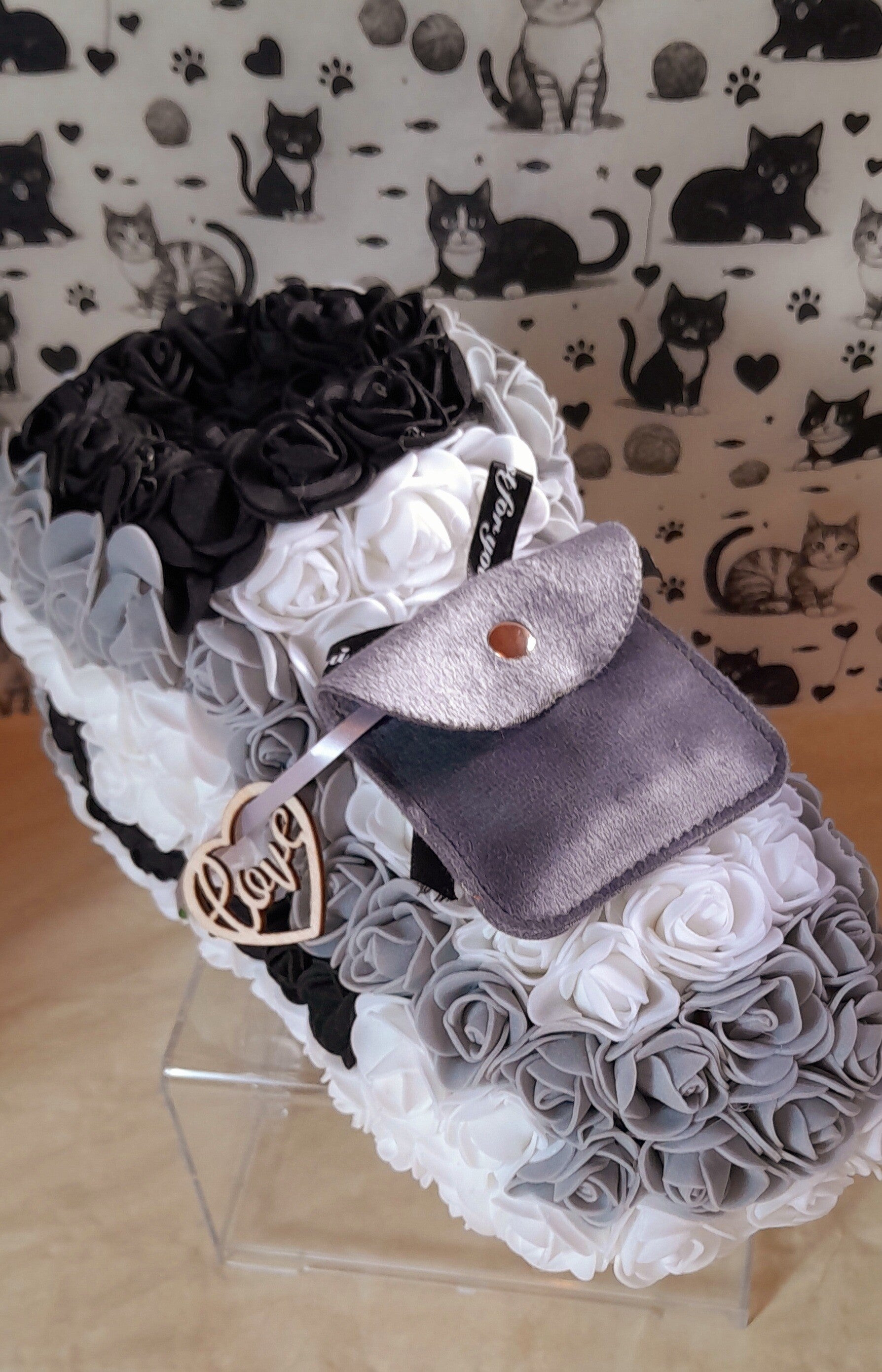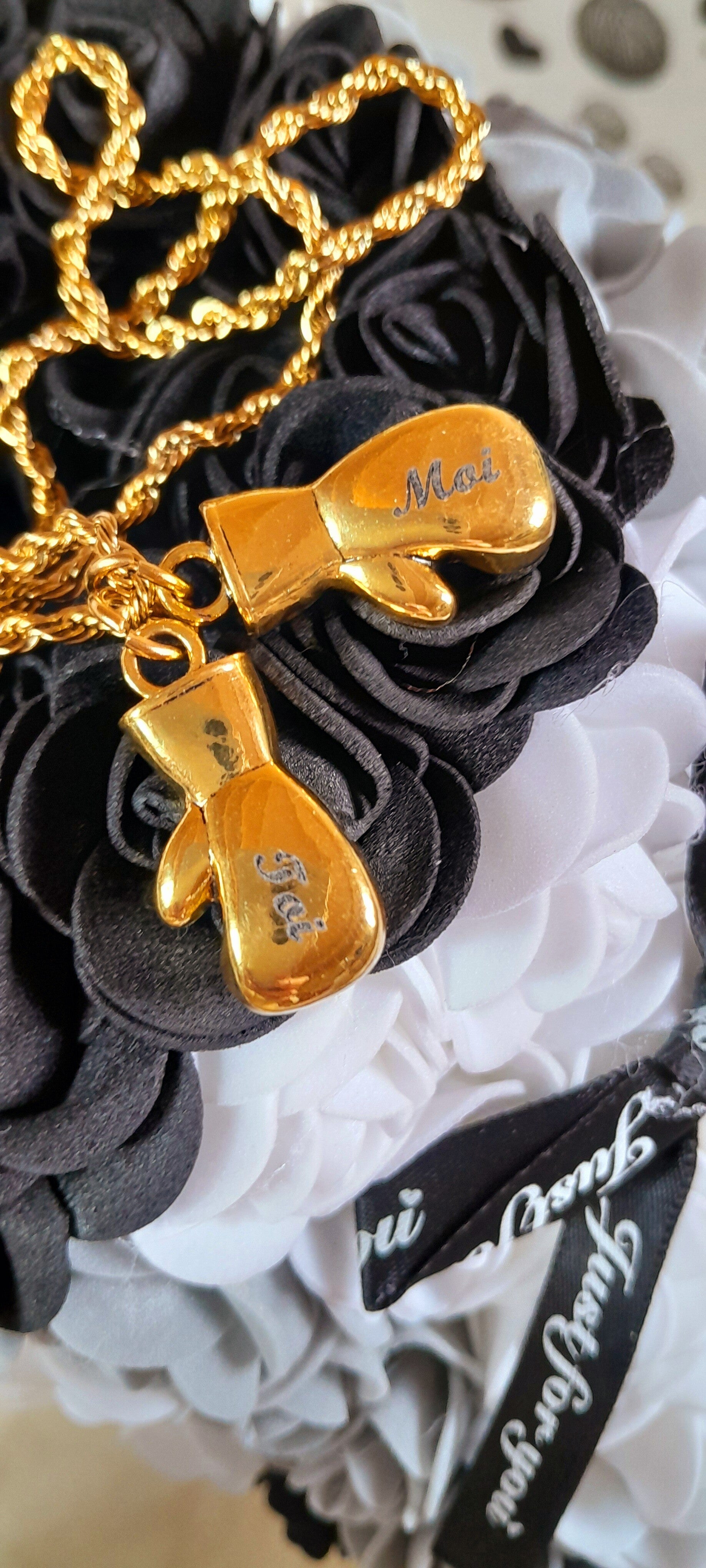 Basket en roses grises, noires et blanches artificielles de 24cm. Elle est accompagnée d'un magnifique collier gants de boxe en acier doré inoxydable de 60cm dans sa pochette velour grise.