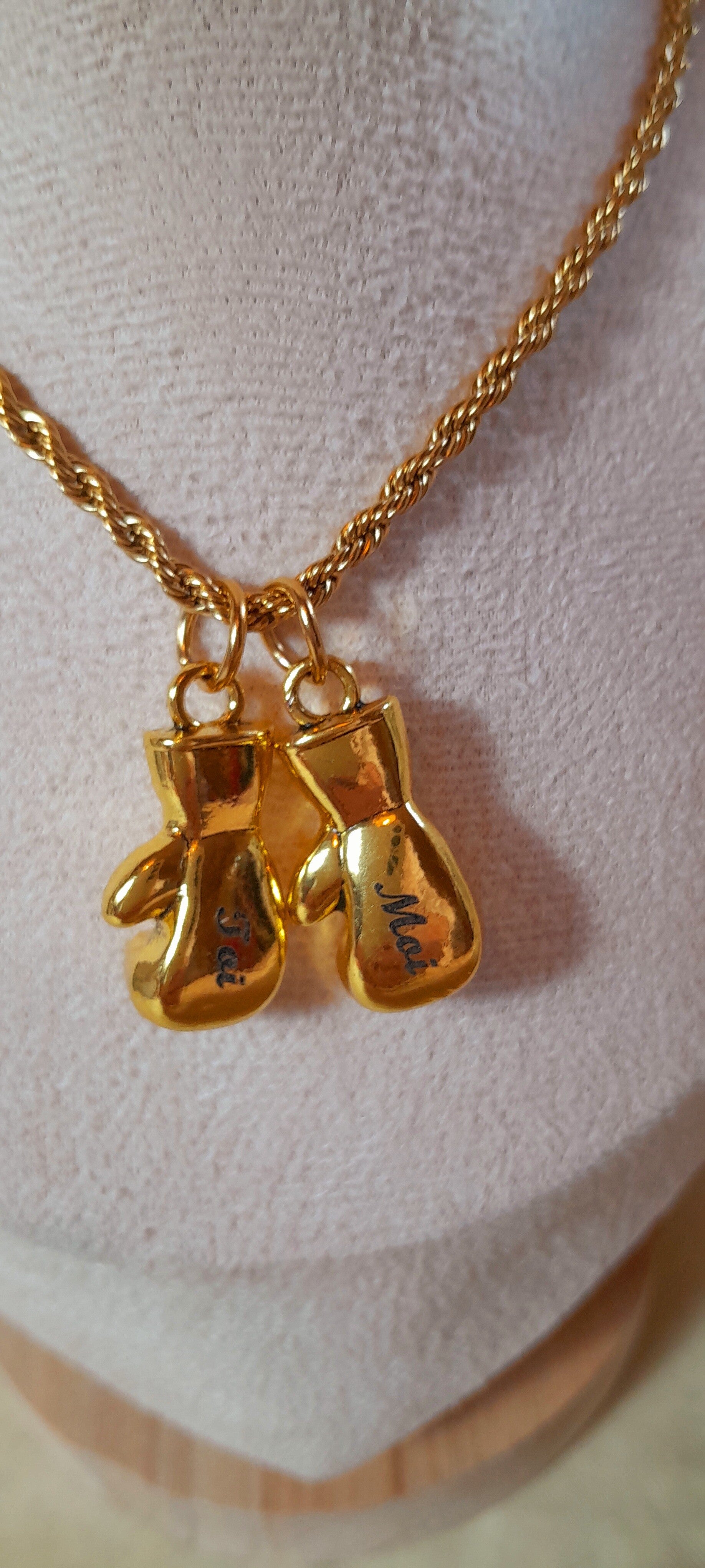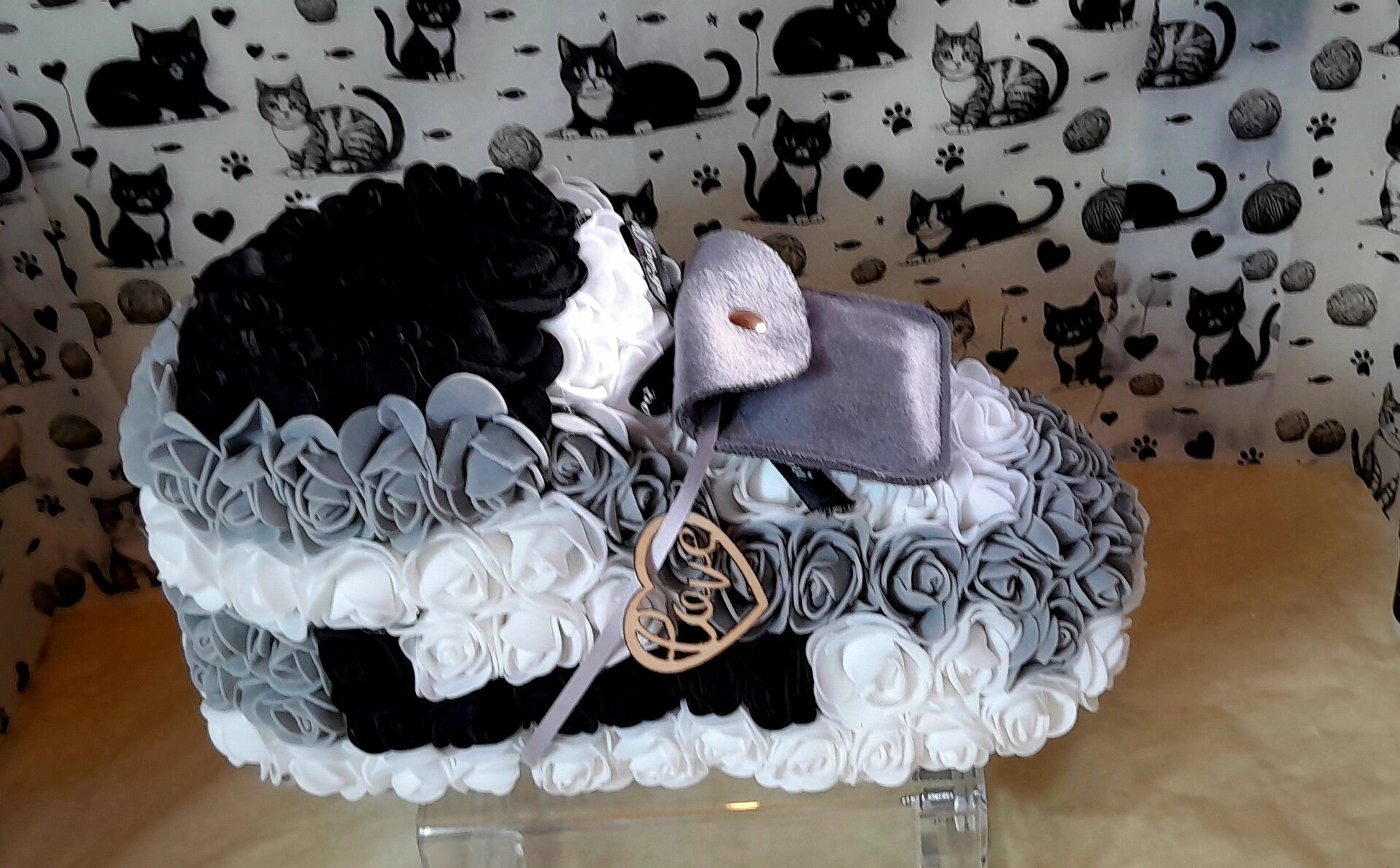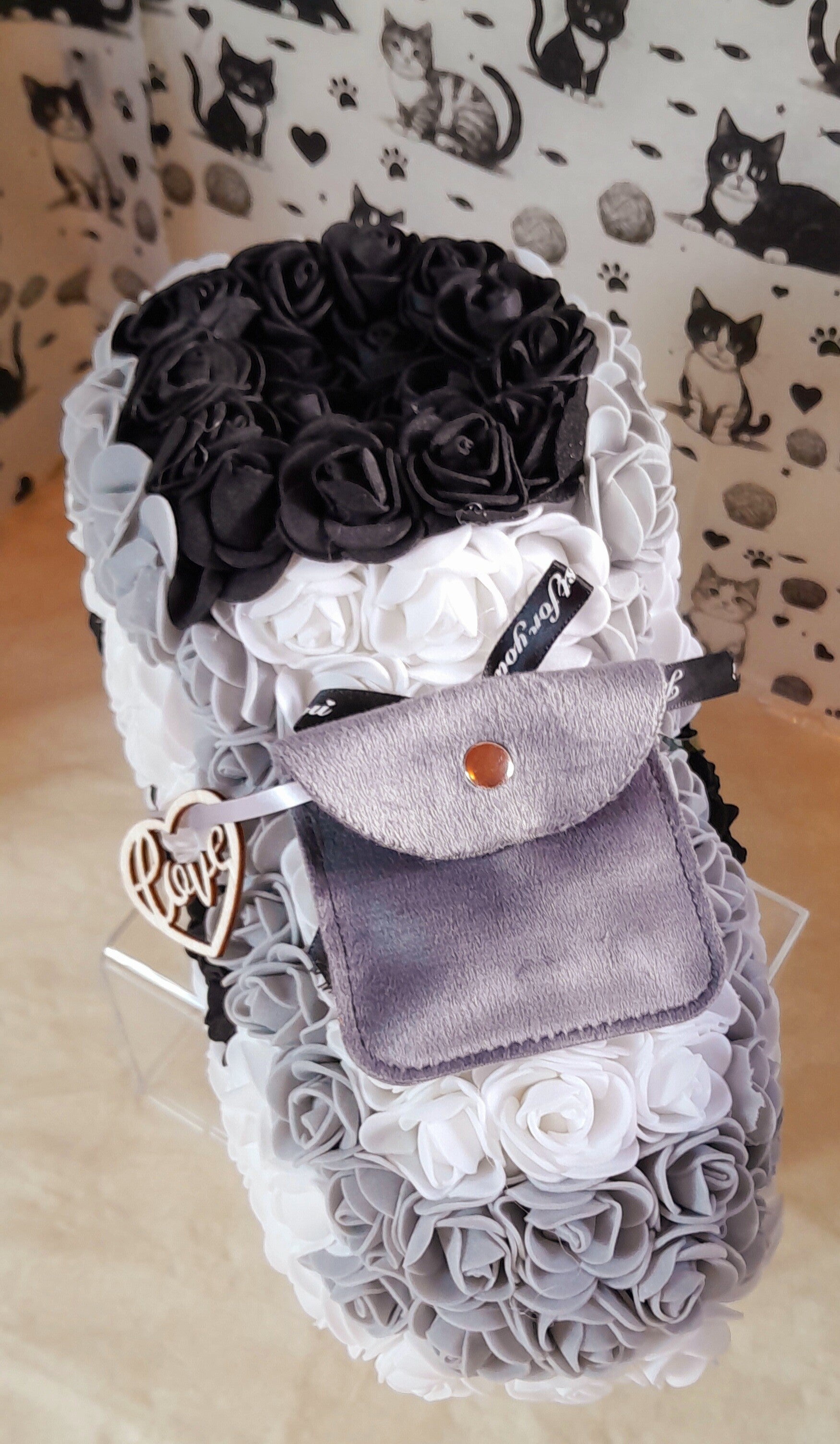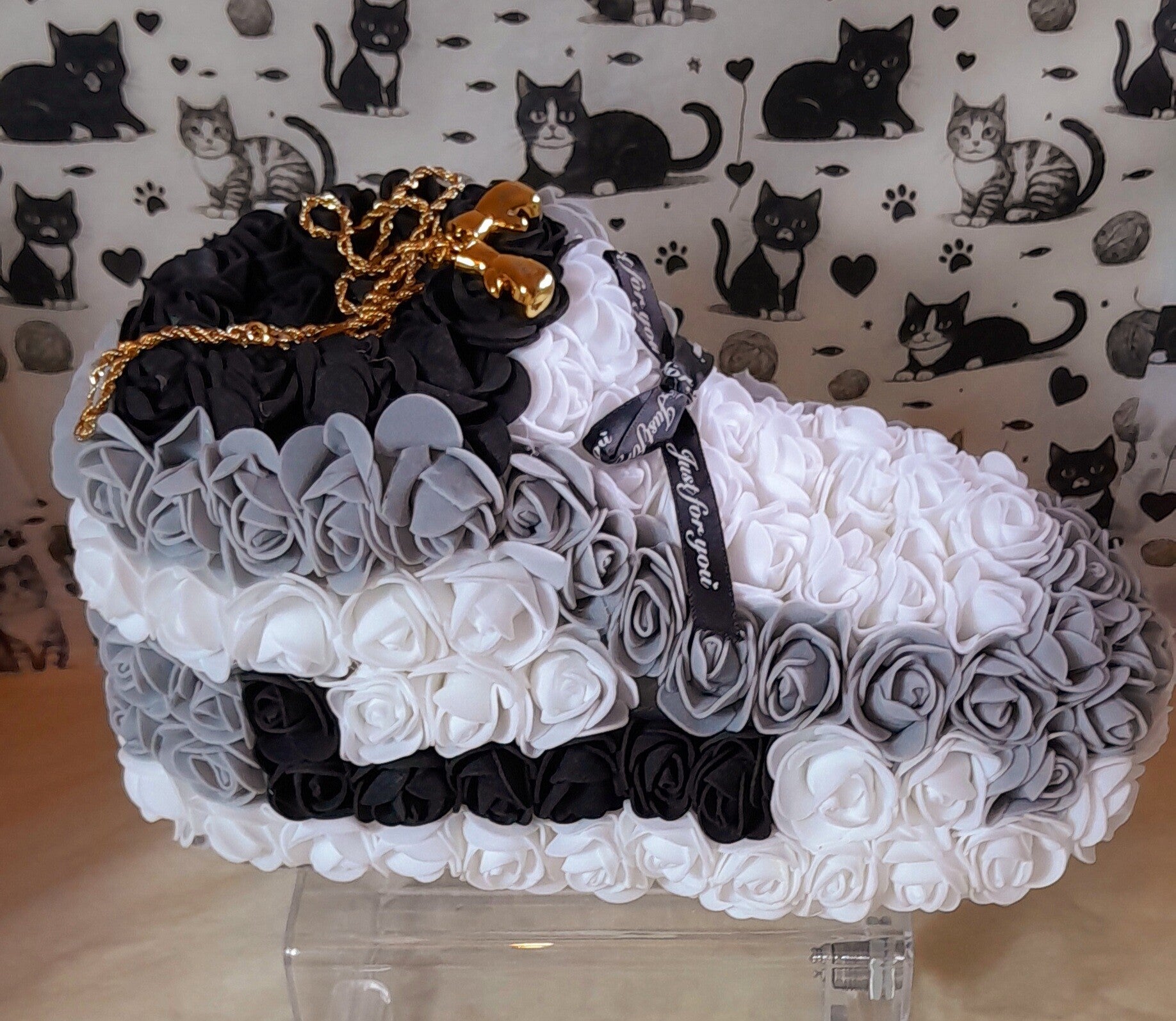 Basket en roses grises, noires et blanches artificielles de 24cm. Elle est accompagnée d'un magnifique collier gants de boxe en acier doré inoxydable de 60cm dans sa pochette velour grise.