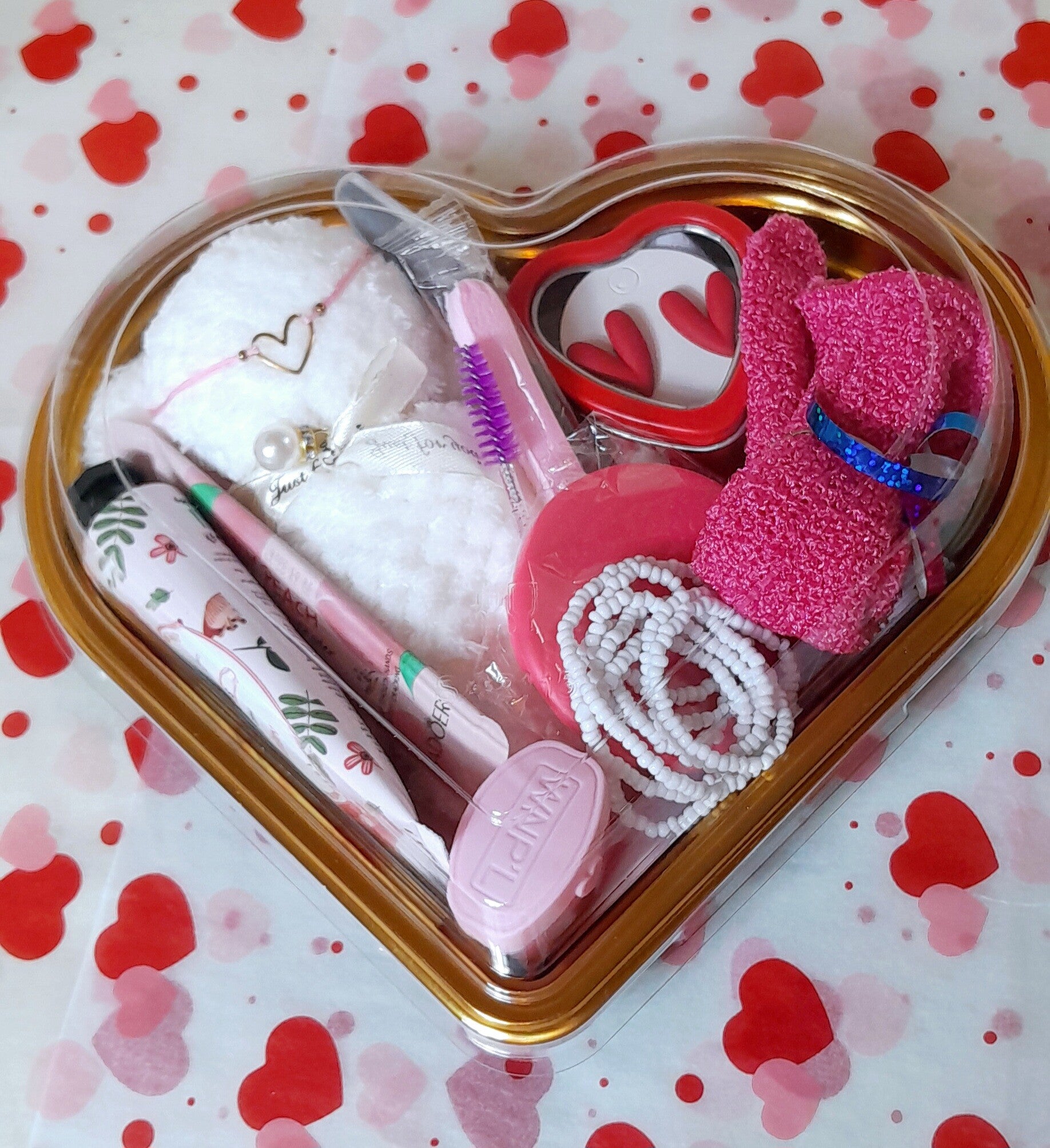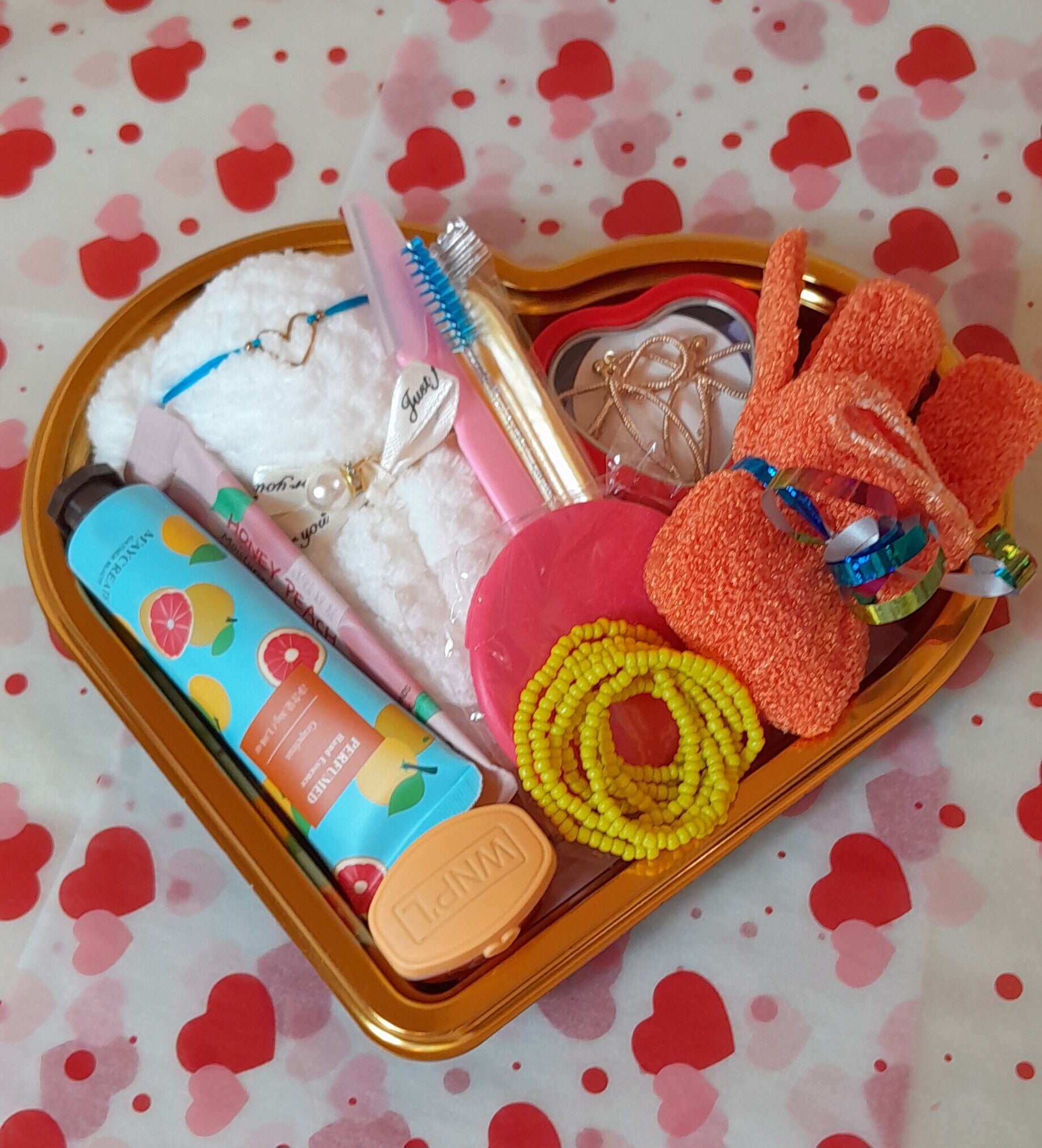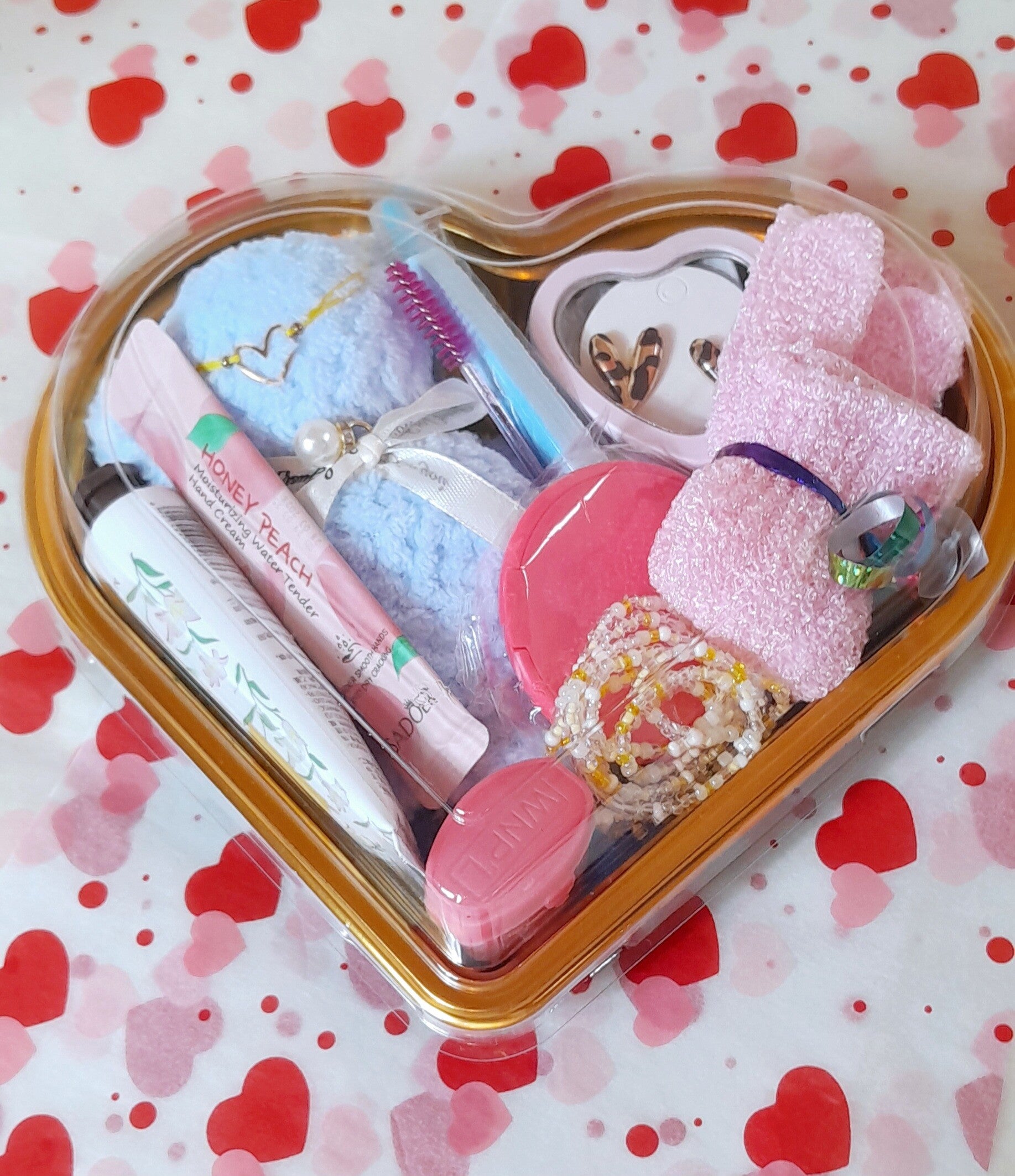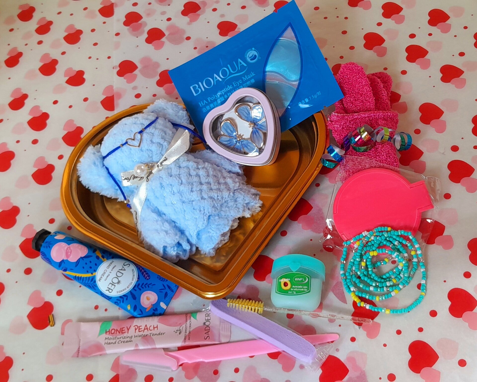 Cœur garnis avec une serviette individuelle nounours bleu, une crème hydratante pour les mains, une crème hydratante pour le visage, un baume à lèvres vaseline, un gant exfoliant, un patch anti-cernes, un bracelet coeur, un collier de perles, un rasoir à sourcils et une jolie paire de boucle d'oreilles modèle aléatoire.