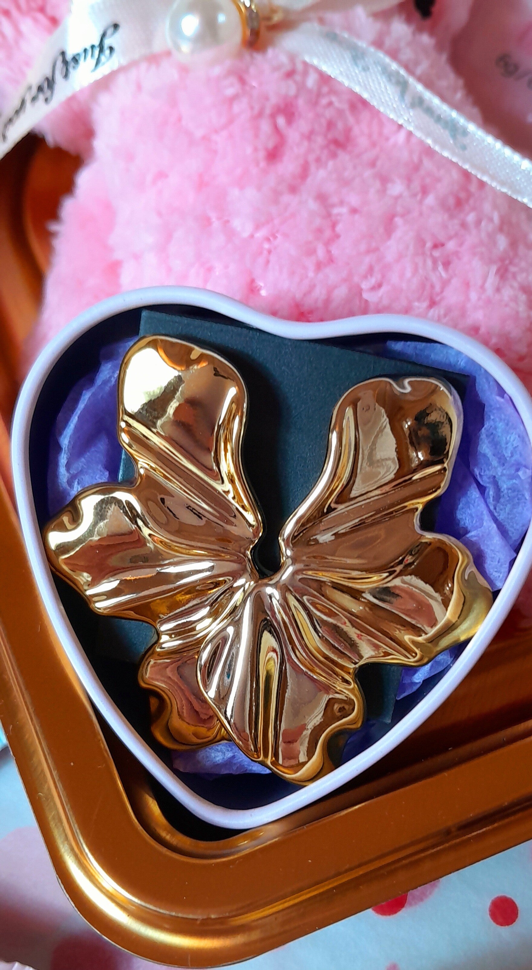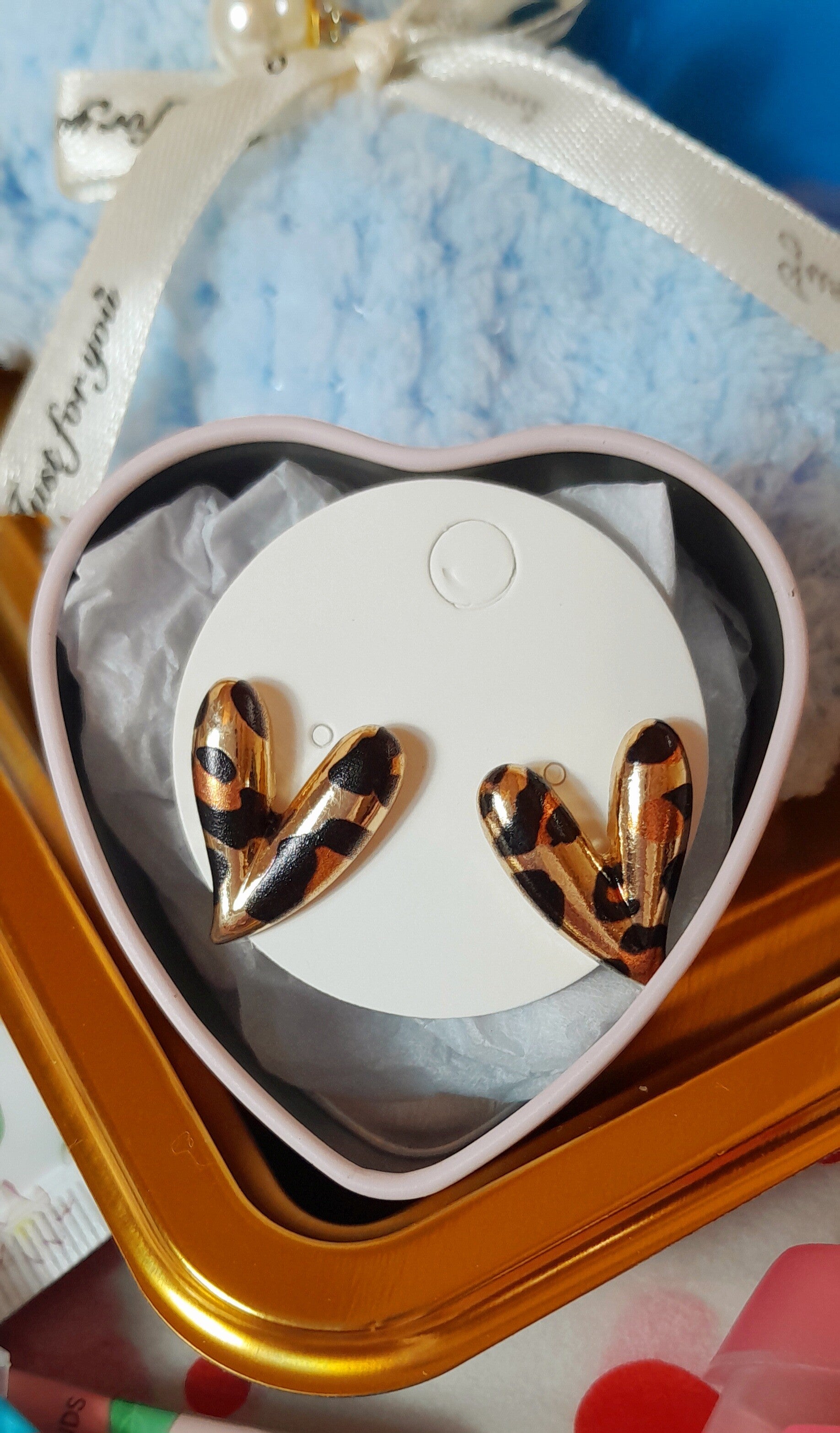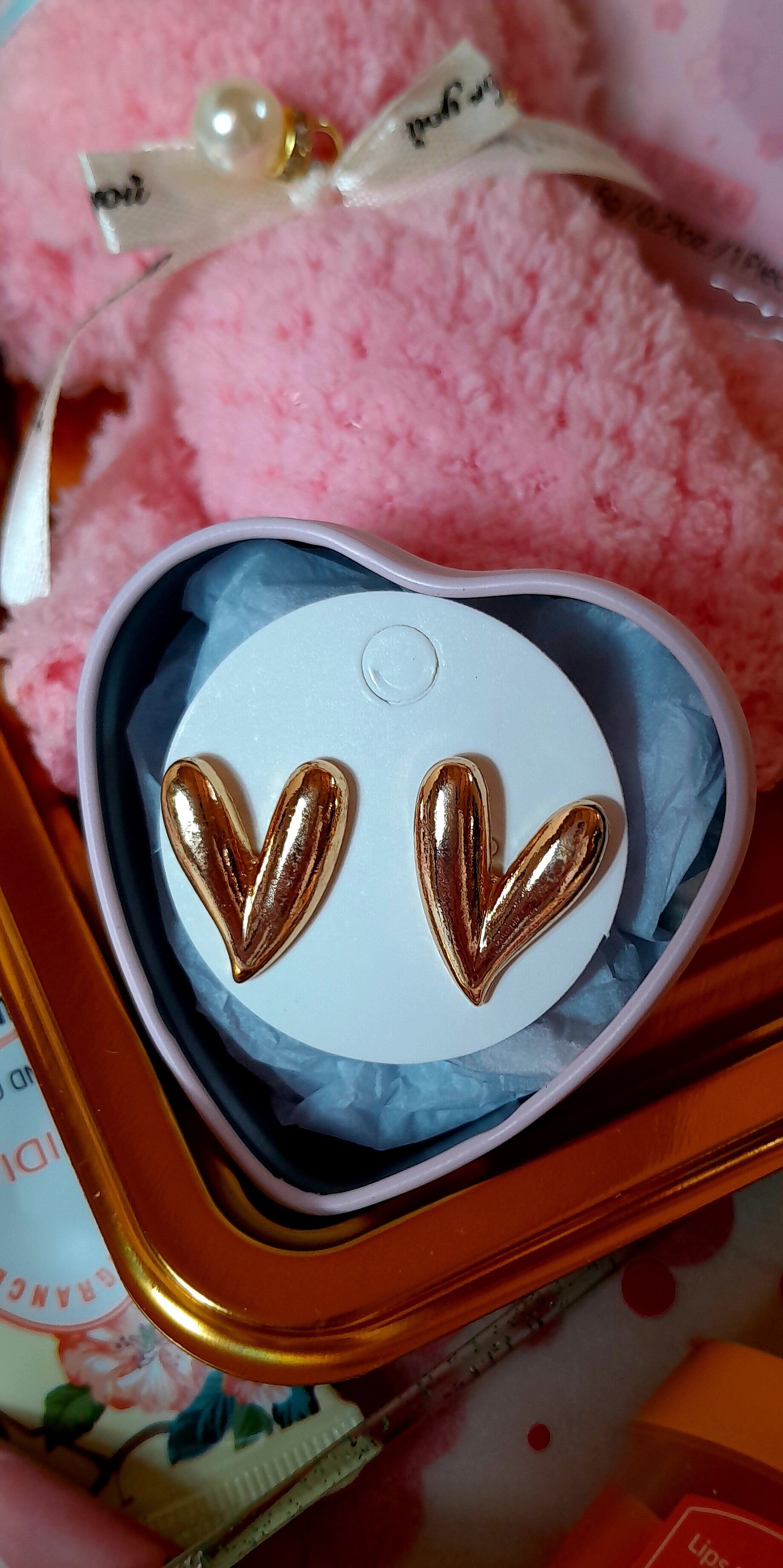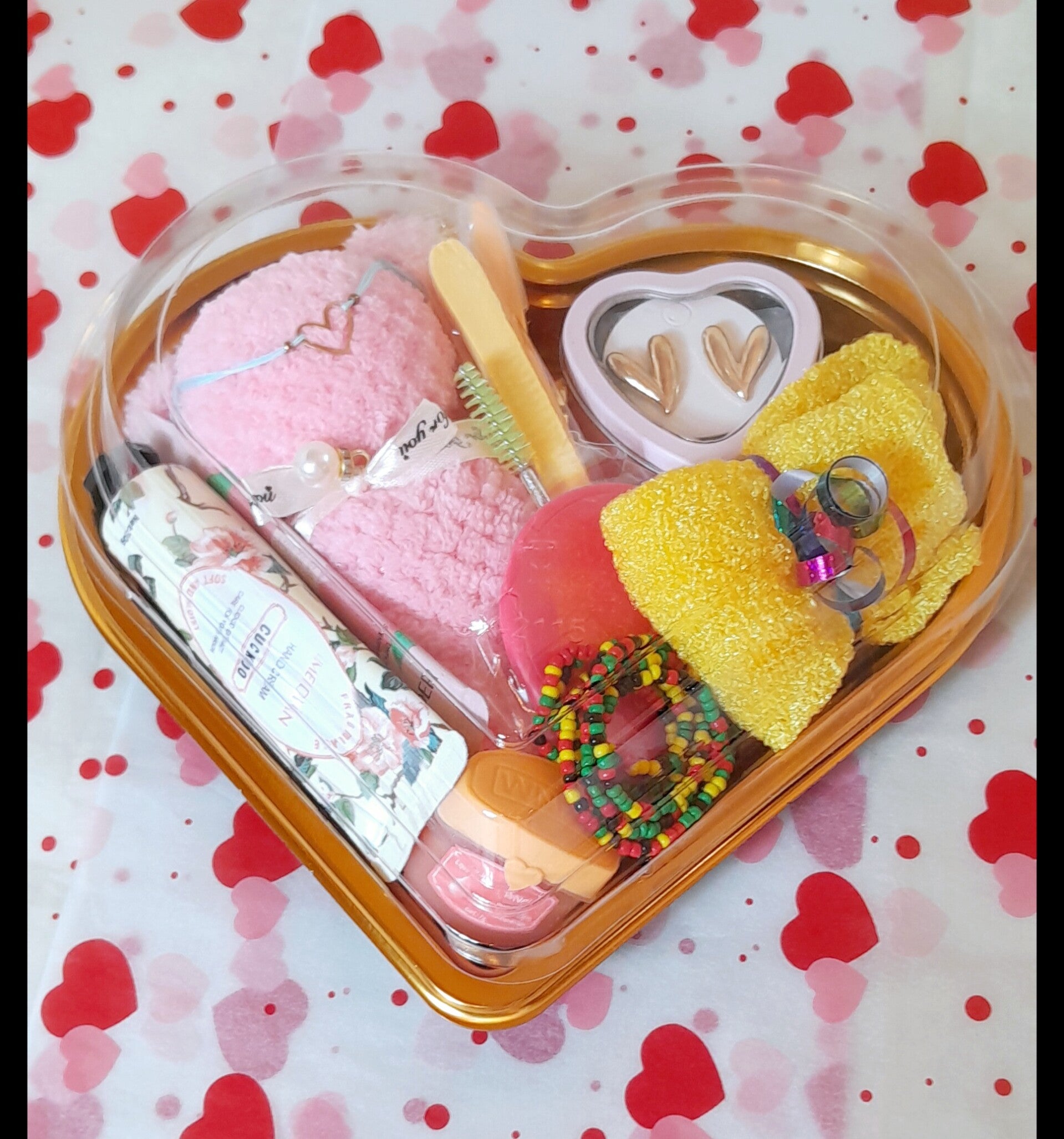 Cœur garnis avec une serviette individuelle nounours bleu, une crème hydratante pour les mains, une crème hydratante pour le visage, un baume à lèvres vaseline, un gant exfoliant, un patch anti-cernes, un bracelet coeur, un collier de perles, un rasoir à sourcils et une jolie paire de boucle d'oreilles modèle aléatoire.