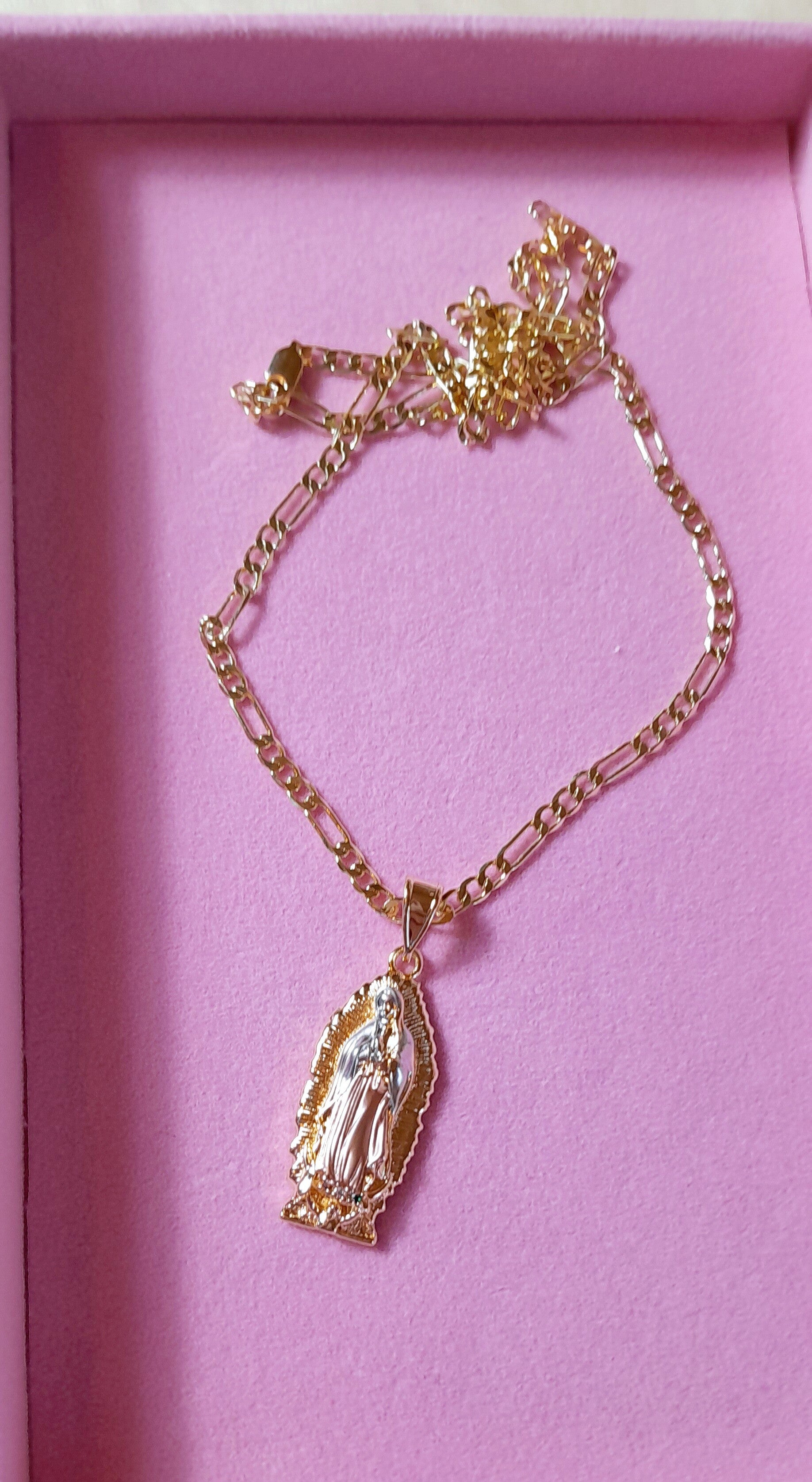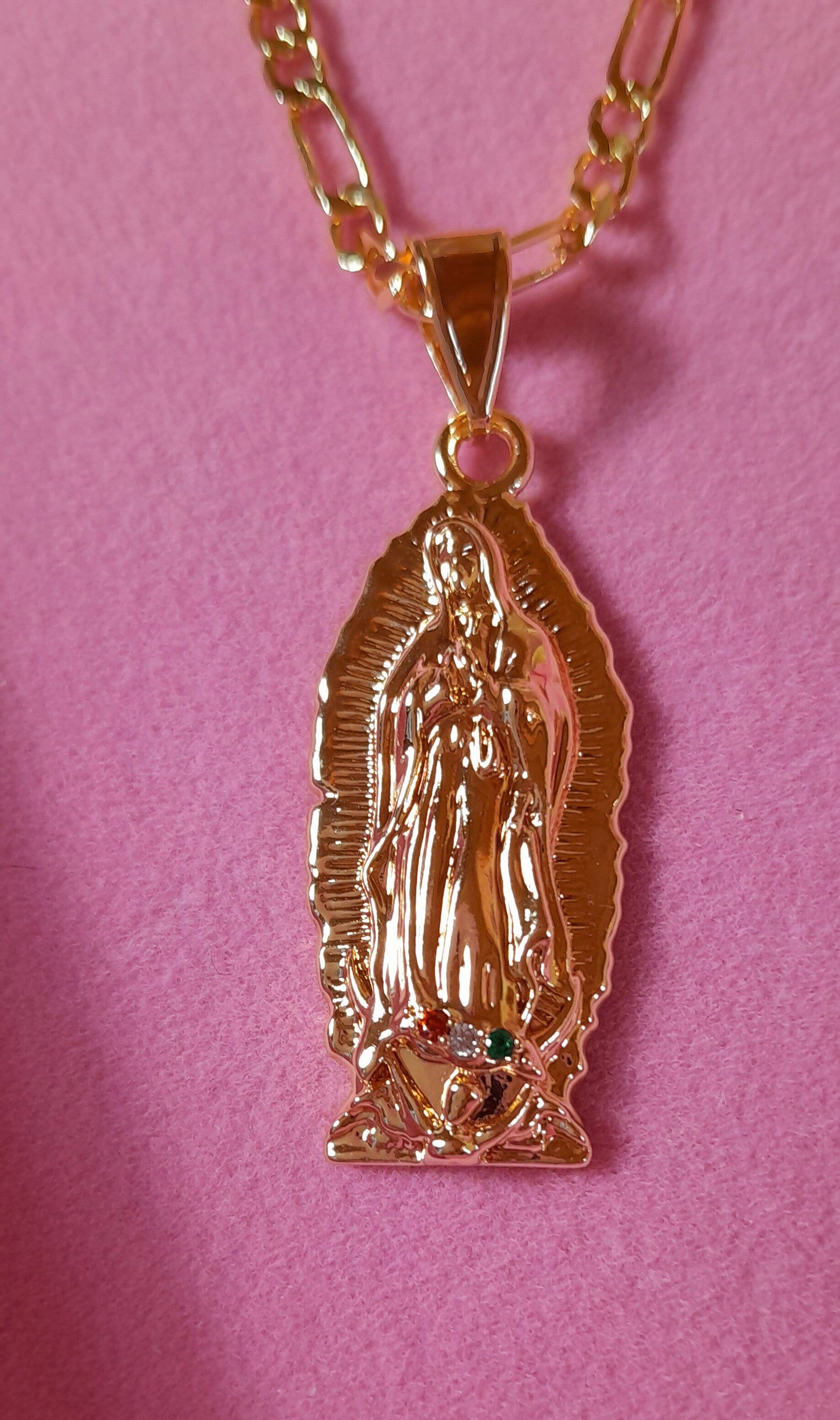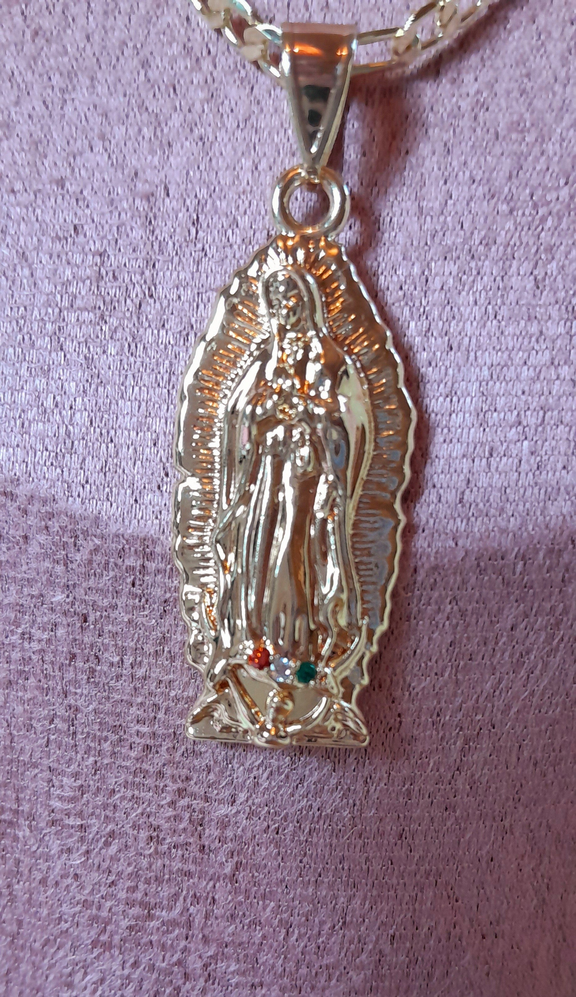Collier Sainte Vierge en 3 tons dorée, rosée et argenté 3 strass délicatement sertis à ses pieds. Chaîne 55cm en acier doré inoxydable pendentif 4.5cm. Cadeau parfait pour offrir à l'occasion d'une confirmation, baptême, communion ou un anniversaire. Collier unisexe