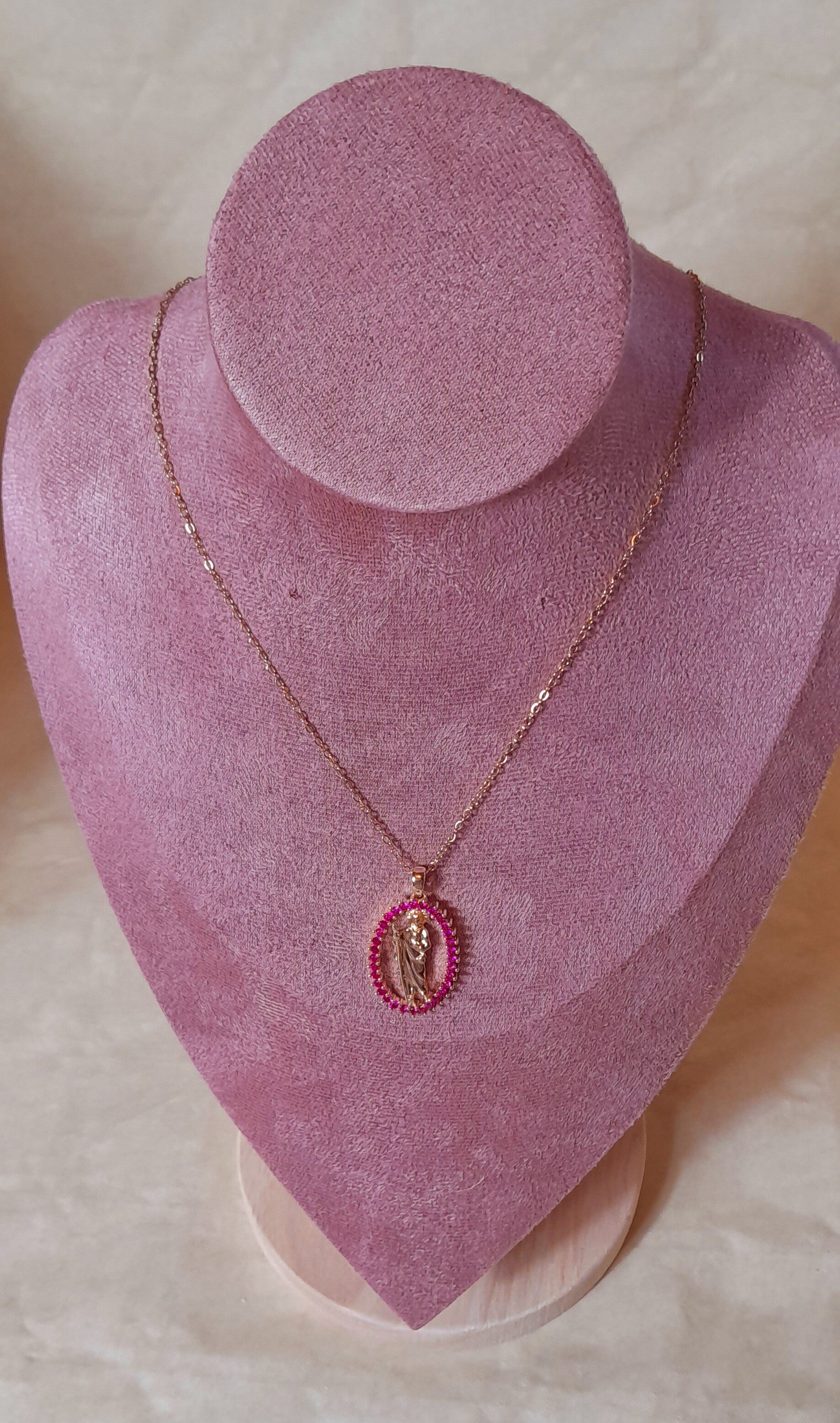 Collier Sainte Vierge en acier doré inoxydable 2.5cm dans un anneau de rubis cubique synthétiques, Caine 45cm+5cm.